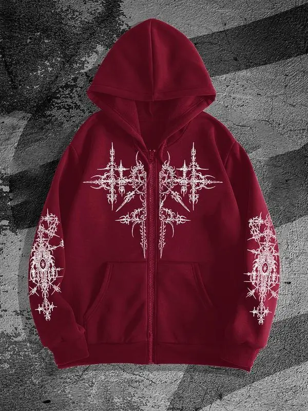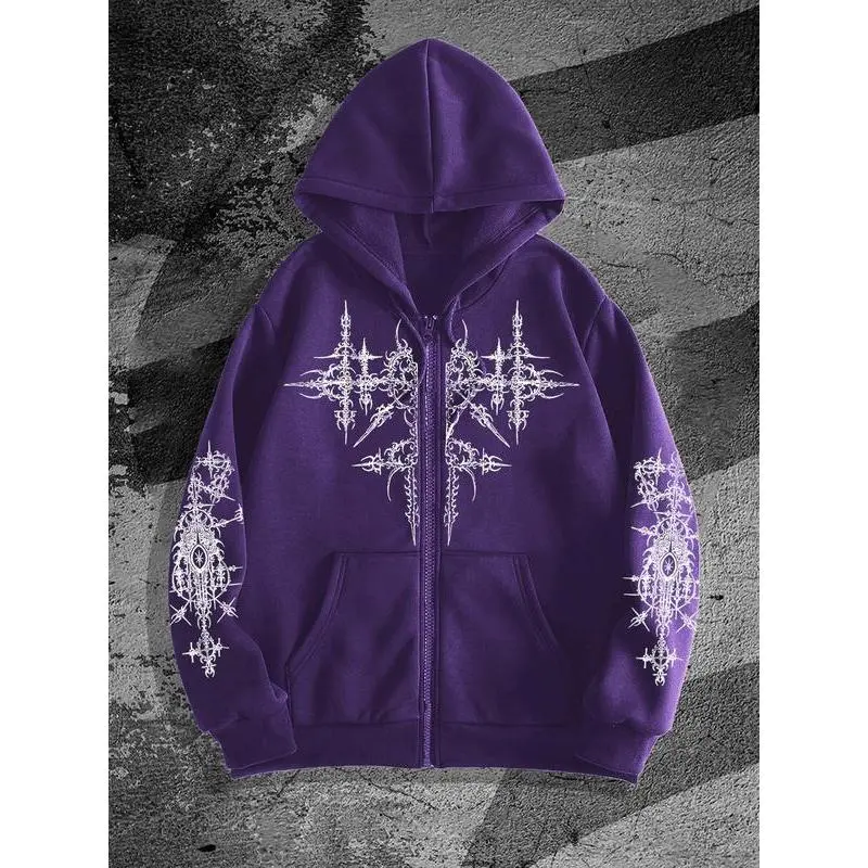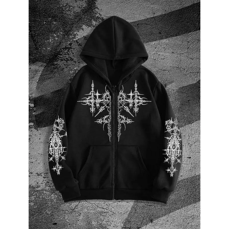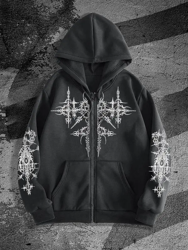 Men's Gothic Style Drop Shoulder Zipper Up Hoodie, Regular Fit Casual Longsleeves Graphic Hooded Sweatshirt for Fall & Winter, Men's Top for Daily Wear, Pullover, Drawstring Zip Hoodie