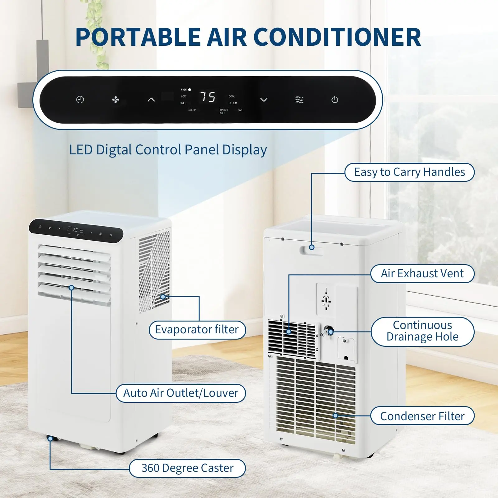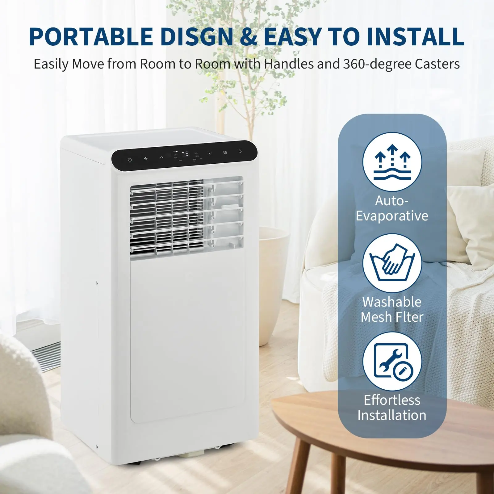 【3-in-1 Cooling/Dehumidify/Fan Mode】 Enjoy the convenience of Cooling, Fan, and Dehumidify modes with this air conditioner portable. The 50 pints/day dehumidifier improving indoor air quality year-round. Perfect for living room, bedroom, apartment, home kitchen, basement, office and more, this portable ac adapts to every season