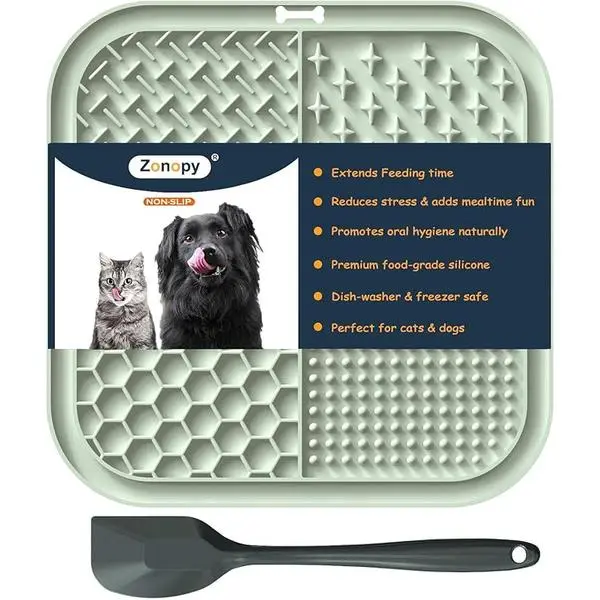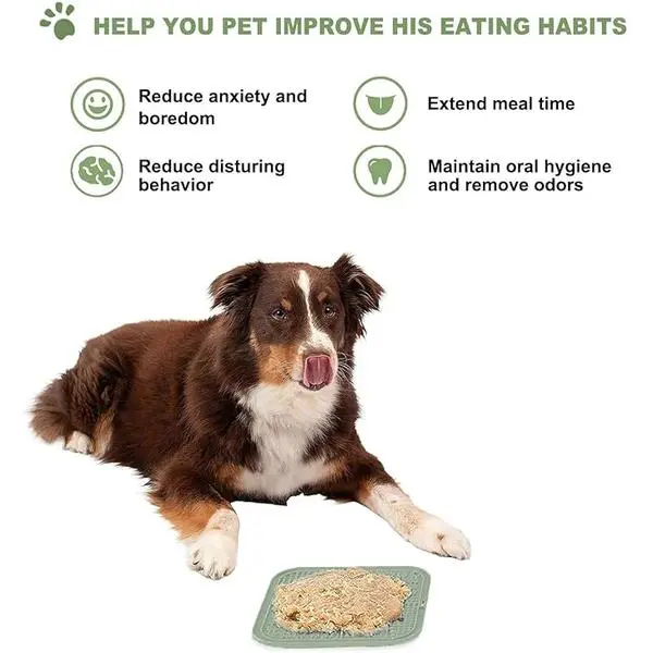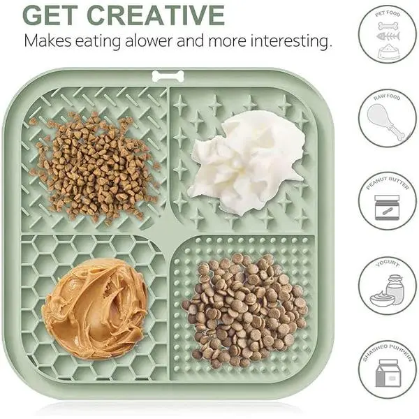 ·【Slow Feeder Licking Mat for Dogs & Cats】This mat features 4 distinct textured surfaces, perfectly suited for spreadable treats like cream cheese, yogurt, peanut butter, and more. It's a peanut butter slow feeder mat designed to prolong feeding time and support better digestion for dogs. This licking mat is also ideally sized for cats, puppies, and dogs of all sizes—small, medium, and large