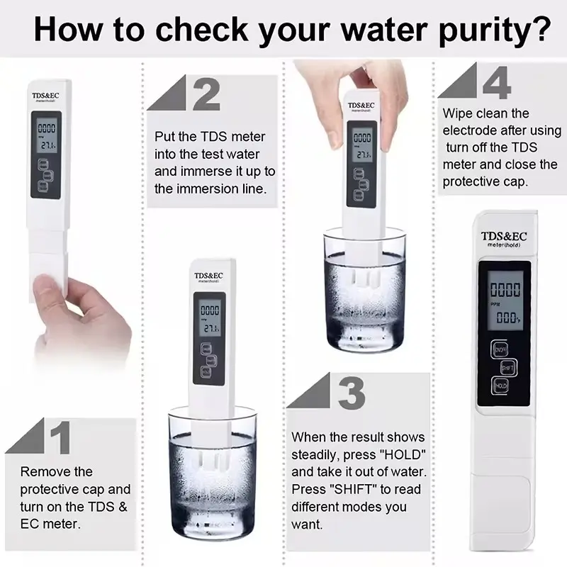【LCD Display】: Features a digital LCD screen for clear and accurate readings of water quality parameters.