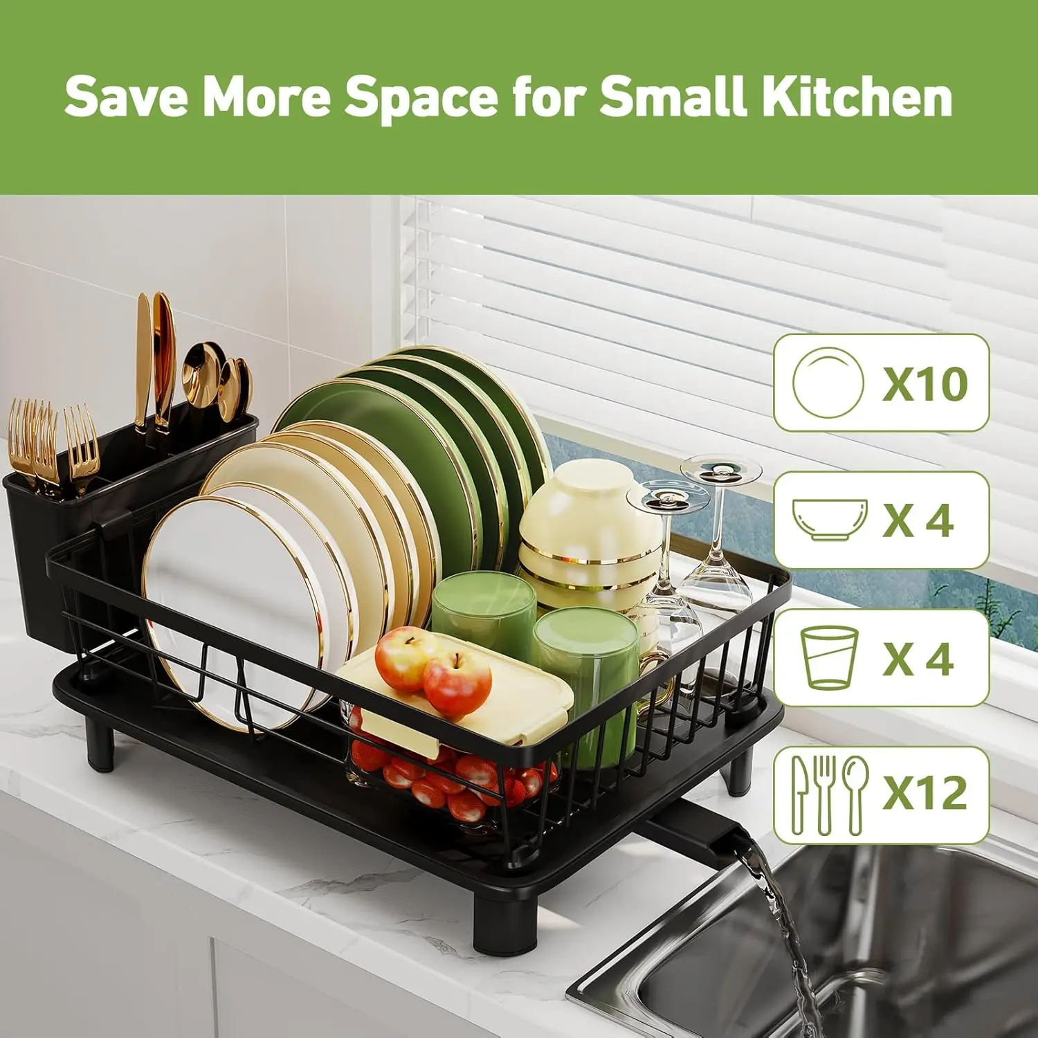 [Automatic Drainage & No Leaking]: Our dish drainer rack has an upgrade drainage groove design on the drainboard and the utensil holder to ensure water onto your sink to prevent leaking on your worktop.And the drainage channel is adjustable, you can adjust the position of the dish rack to suit the sink which for directing draining water directly into the sink.[Premium Rustproof Material]: Our Dish drying rack is made of premium material and anti-rust coat materials that ensure will not rust and discolor.Sturdy and long-lasting and easy to clean.This draining board rack can withstand the test of kitchen time.[Large Capacity Dish Rack]:Our sink drainer rack size is 15*11*5.9 inches/38*28*15 cm.Can provide more space than ordinary draining racks.Include plate racks,cutlery holders,cup holders and chopping board holders to meet all needs for hanging of kitchen utensils.Providing ample storage space for all your kitchen.[Easy to Install]: This kitchen dish rack is easy and quick to assemble without using tools.Just follow the installation guide that you can finish it completed.Package includes:1 dish rack1 utensil holder1 drainboard1 swivel spout4 rubber feet.[Space Saving]: This dish drying rack will keep your kitchen counter dry and organize. Can store different types and sizes of cookware such as bowls, dishes, kitchen pots and cups. Save at least 50% of kitchen space Make your kitchen look bright and clean.