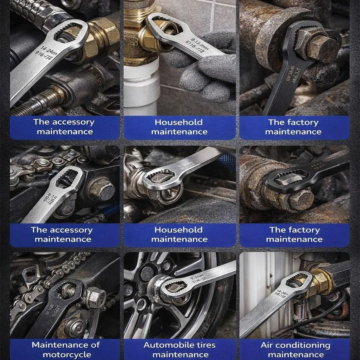 Universal Compatibility:Designed as a universal wrench, it works seamlessly with cars, motorcycles, bicycles, and home projects. Its self-tightening design ensures a secure fit every time, reducing slippage and protecting fasteners. Perfect for automotive repair, machinery, or household maintenance tasks