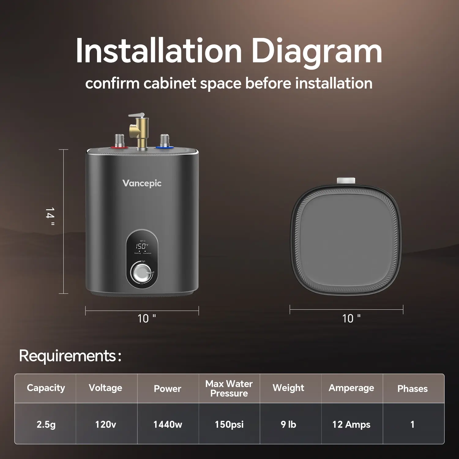 ·Space-Optimized Modern Design: Featuring a sleek, compact design (10"x10"x14"), this tankless unit is engineered for seamless integration under sinks or within cabinetry. It offers superior space efficiency compared to traditional tank heaters. : Please reserve enough installation space — at least 2 inches on both sides and 5 inches on the top for safe and easy installation.