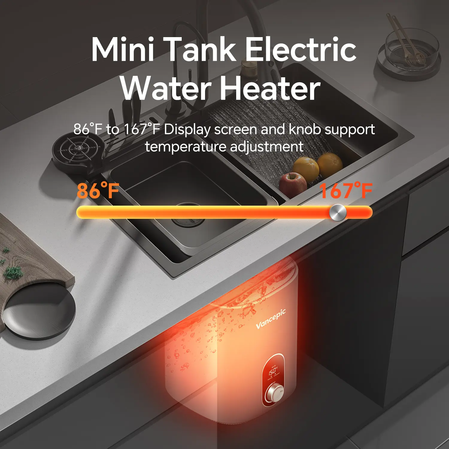 ·Efficient Rapid Heating Technology: Equipped with a 1440W molybdenum-gold heating rod, this water heater delivers an exceptional 99% thermal efficiency, enabling swift hot water delivery and rapid temperature recovery. The adjustable temperature range spans from 86°F to 167°F for precise control.