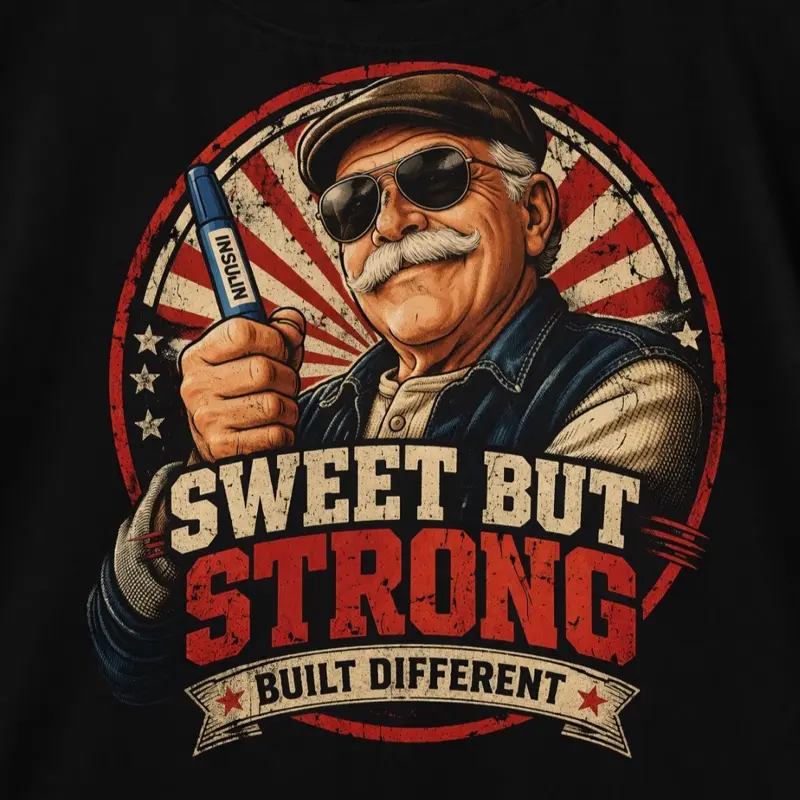 This T-shirt features a man holding an insulin injection pen, symbolizing strength and resilience. The bold text "Sweet But Strong" and "Built Different" inspire those battling diabetes. It's a powerful message for healthy living. 🌟