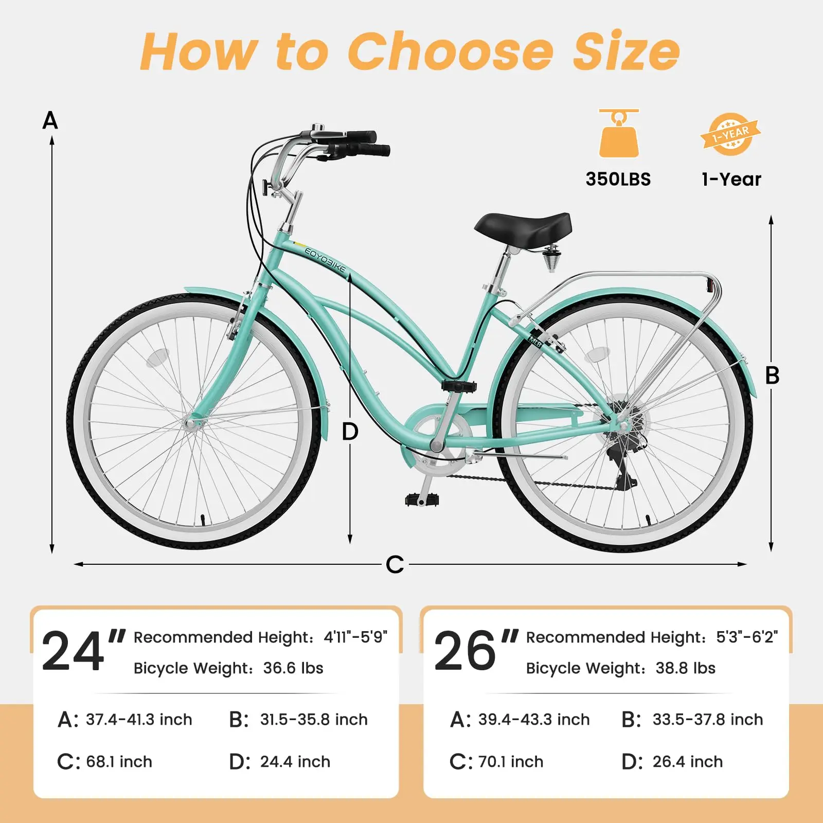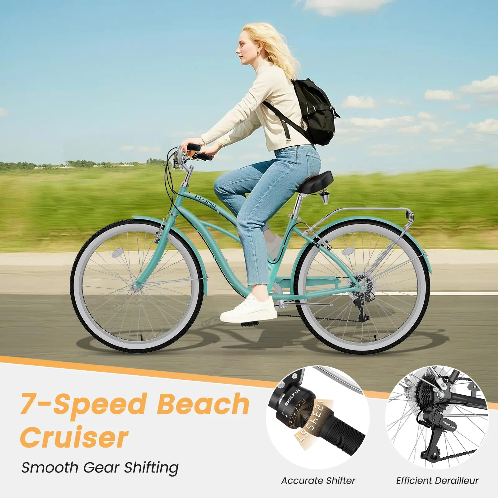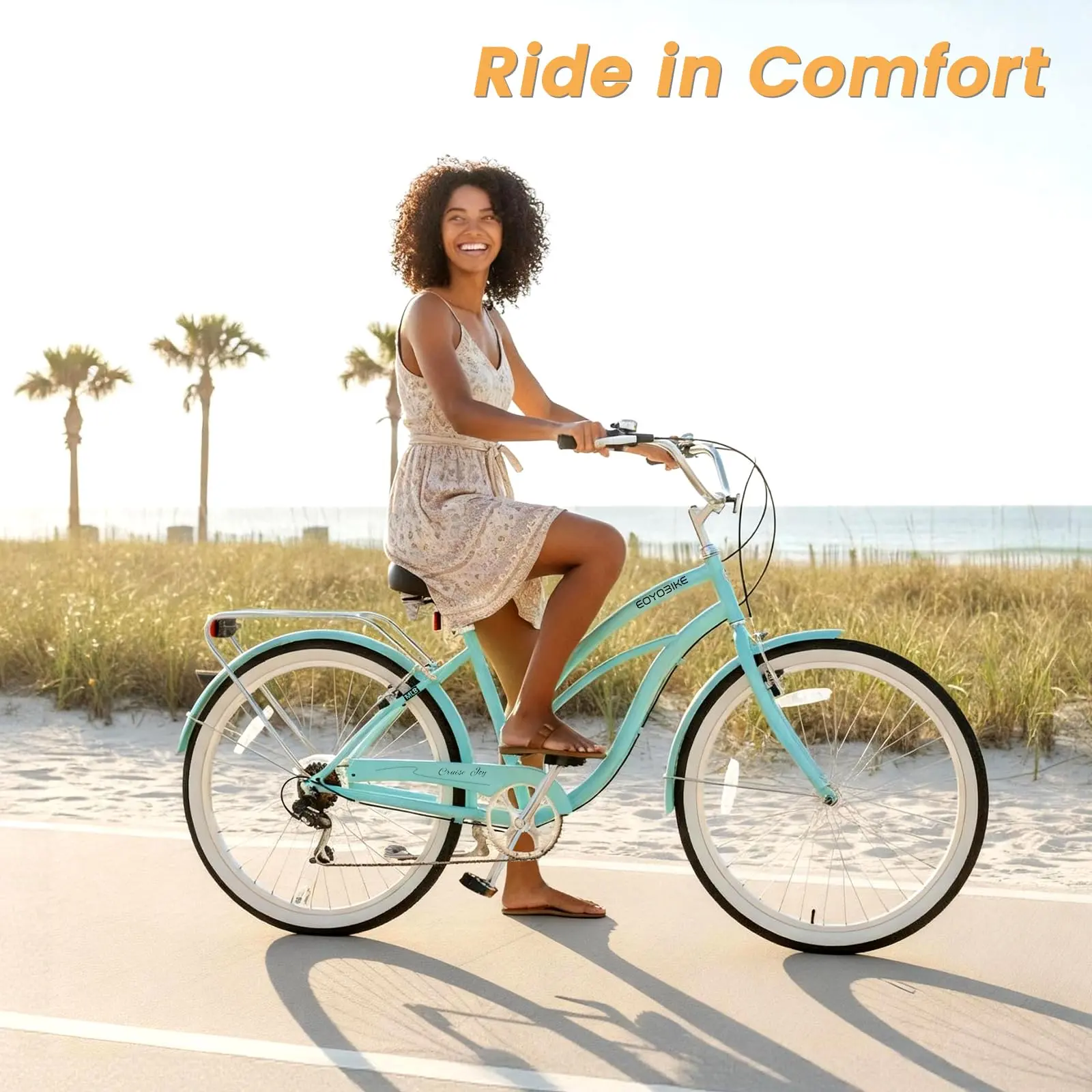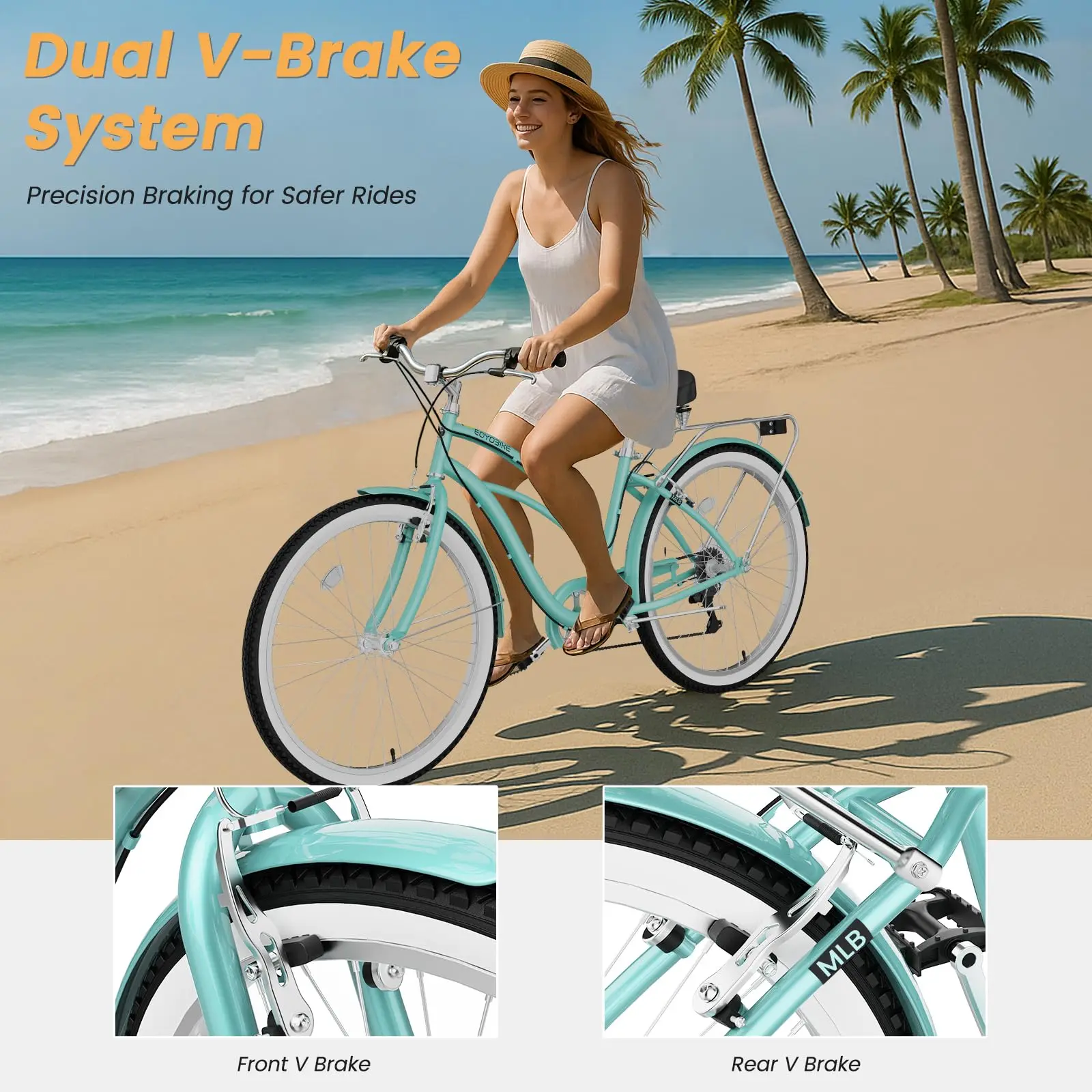 ·7-Speed Beach Cruiser Bike: Equipped with a smooth 7-speed gear system, this womens cruiser bike makes it easy to handle city streets, beach paths, or light inclines with confidence.