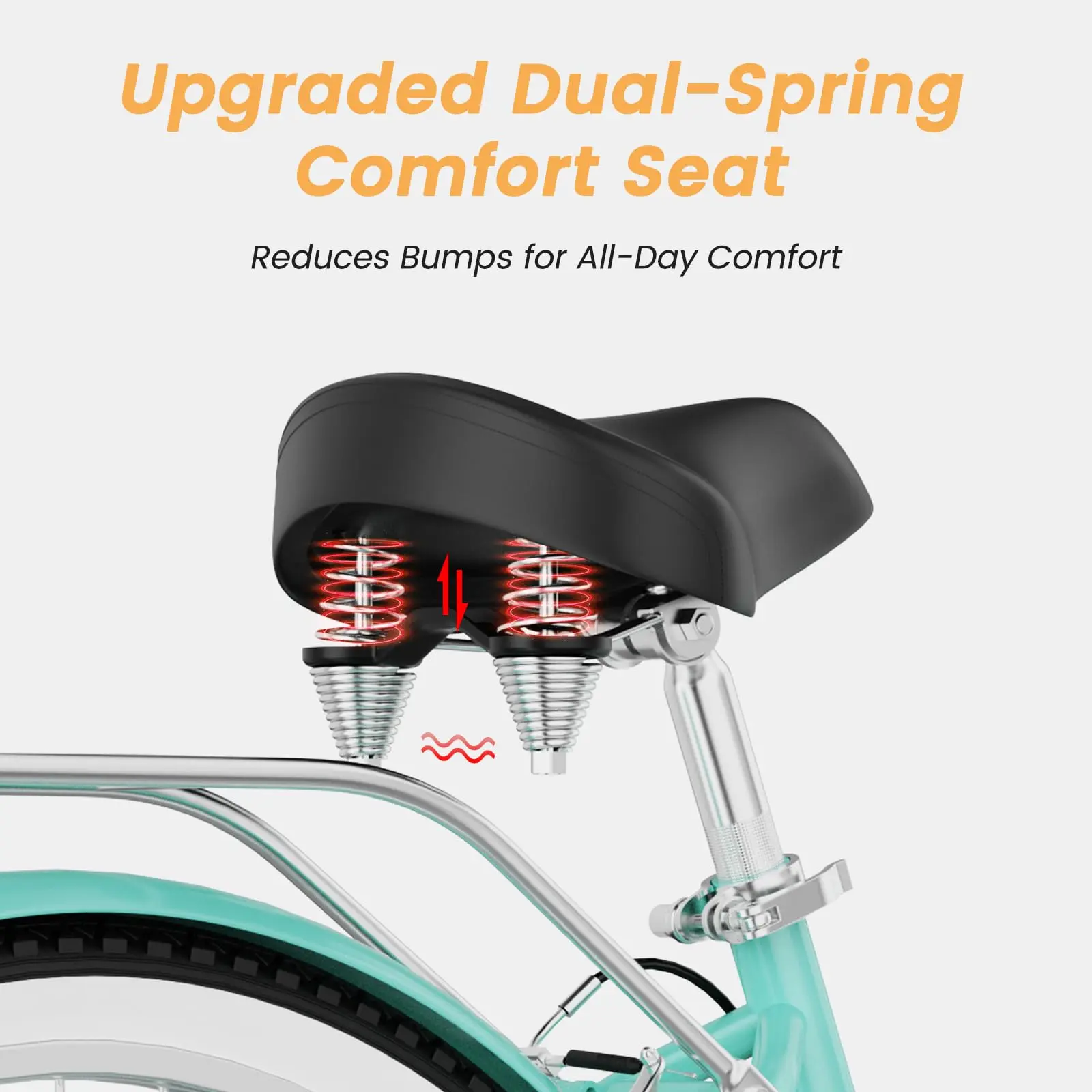 ·Comfortable Ride for Adults: This beach cruiser bike features a wide padded saddle with dual springs, ergonomic handlebars, and an upright riding position—perfect for relaxed, back-friendly rides.