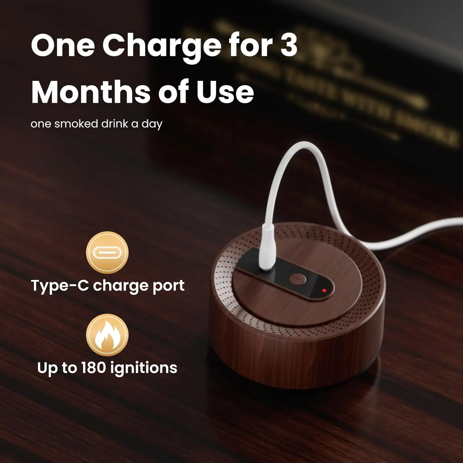 ·Flameless Electric Ignition – Fuel-Free. The electric whiskey smoker kit uses advanced flameless technology, eliminating the need for butane for a safer, cleaner smoking experience. Recharge via USB and enjoy up to 180 ignitions per charge, making it energy-efficient and convenient. This whiskey smoker kit is designed to spark your senses.