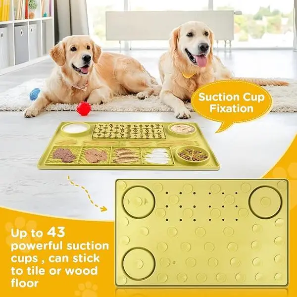 ·This licking pad measures 31.5 inches by 20 inches, suitable for small, medium, and large dogs. It features multiple functional zones: water bowl, dry food, wet food, and slow food areas. Perfect for families with multiple dogs. 🐾