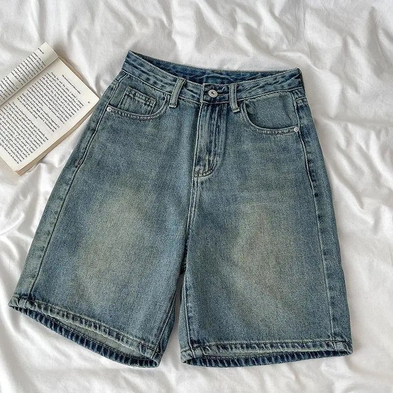 Retro Denim Shorts Women Summer High Waist Loose Wide Leg Straight Short Pants Versatile Casual Half Pants Female Streetwear Fabric Jean