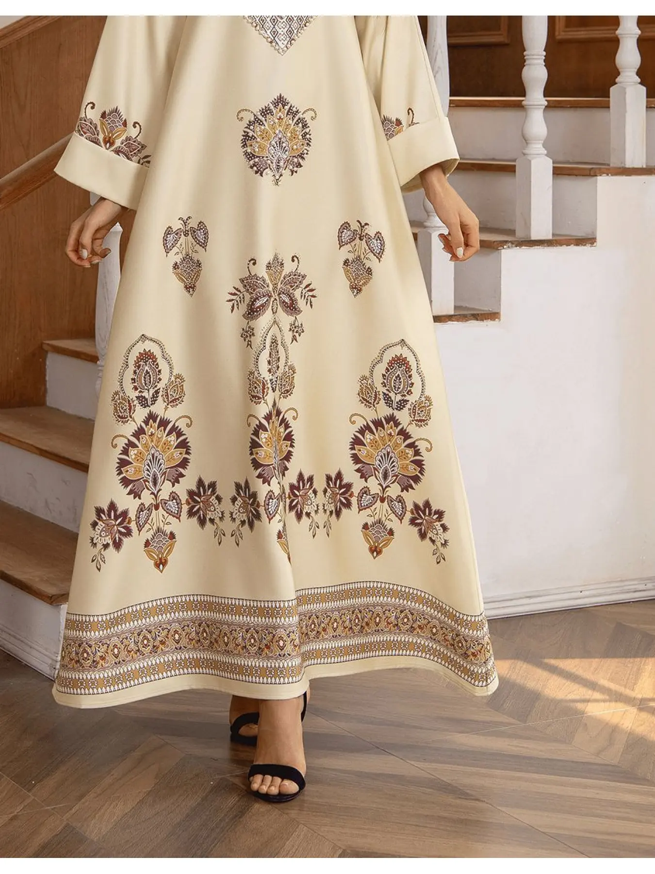 Trendy Rhinestone Printed Muslim Arabic Dress Long Robe for Women