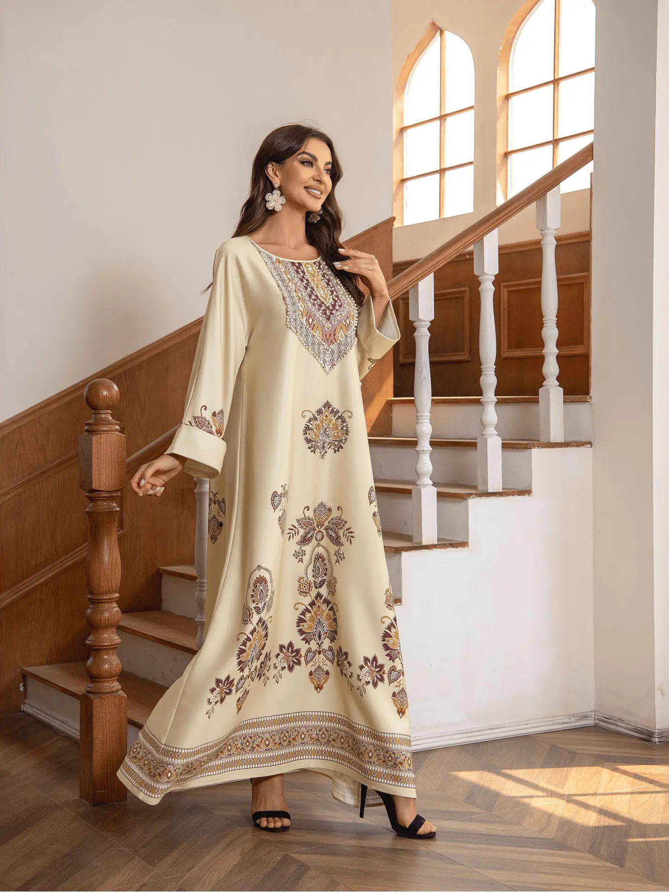 Muslim Dress Round Neck Printed Rhinestone Beaded Loose A-Line Long Robe