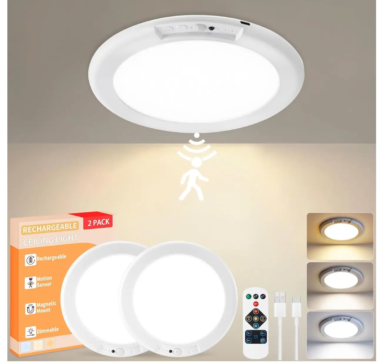 2 Pack Rechargeable Motion Sensor Ceiling Light, Wireless LED Closet Light with Remote, Dimmable 3 Color Temps, Magnetic Mount Night Light for Pantry, Hallway, Laundry, No Wiring Needed lamp Adjustable Display Sconces Touch-Activated