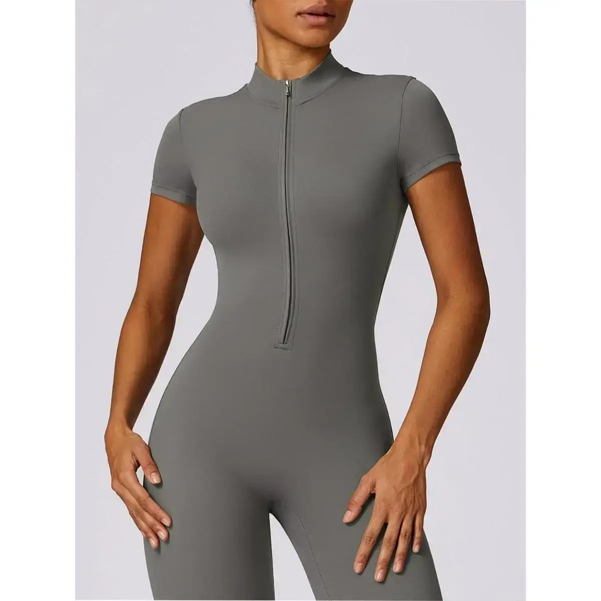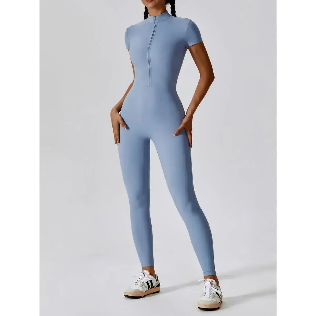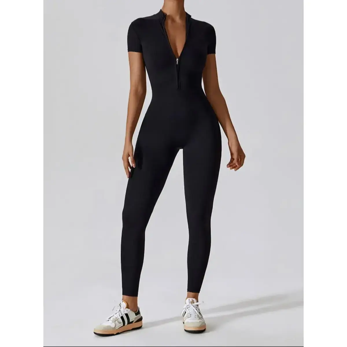 [Quick Drying Fabric]: Made with innovative quick-drying material, this jumpsuit ensures you stay dry and comfortable during intense yoga and gym workouts. [Zipper Closure]: Featuring a functional zipper at the mock neck, this jumpsuit allows for easy wear and provides a sleek look for various activities. [High Waist Fit]: The high waist design enhances support and emphasizes your silhouette, allowing for both performance and flattering shape during workouts. [Short Sleeve Coverage]: With short sleeves, this jumpsuit offers breathability and freedom of movement, ideal for warm weather training and casual outings. [Tight-fitting Cut]: The tight-fitting style guarantees a secure feel, maximizing your range of motion while ensuring the jumpsuit stays in place during exercise.
