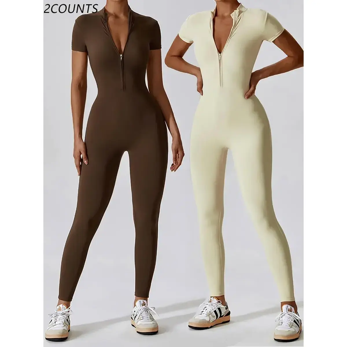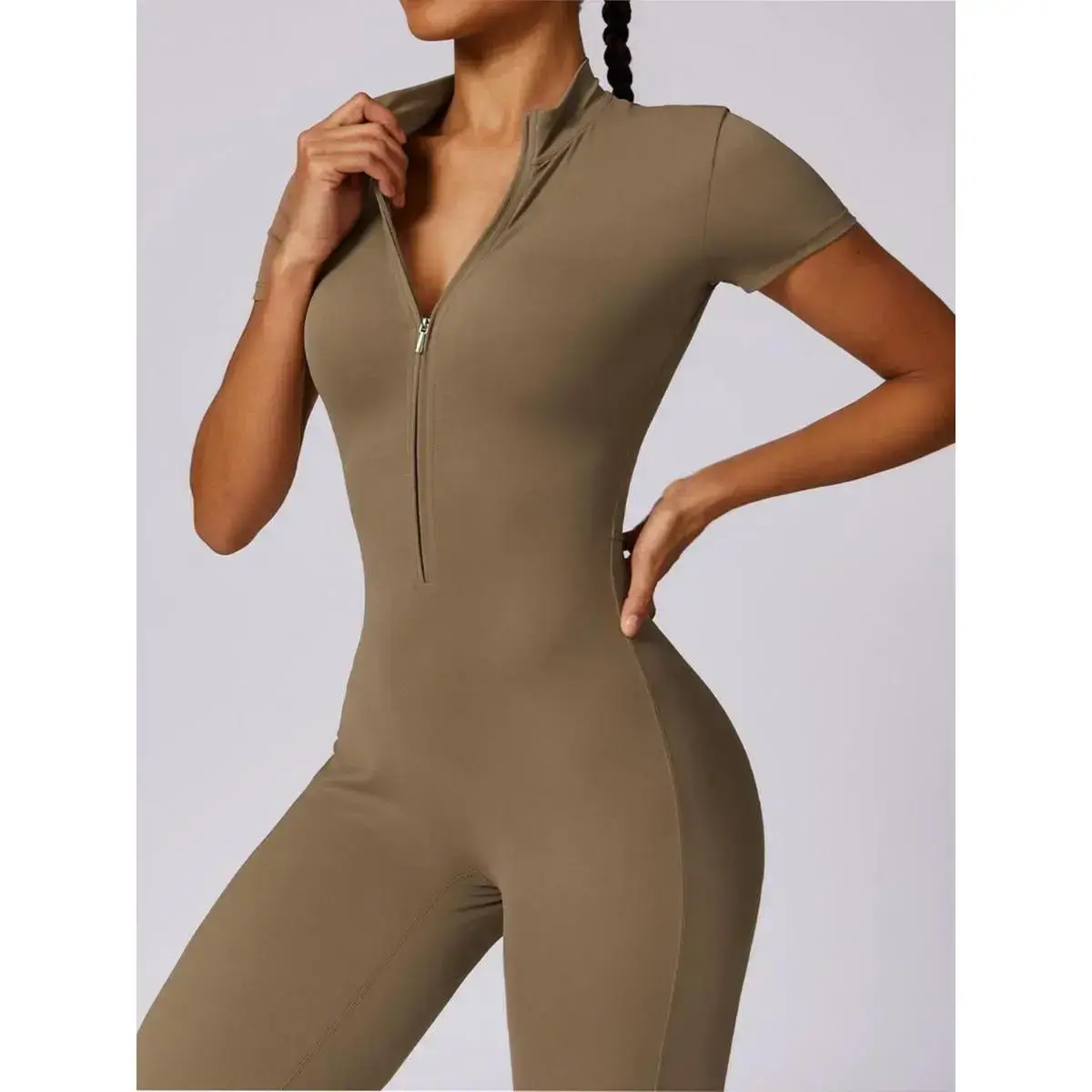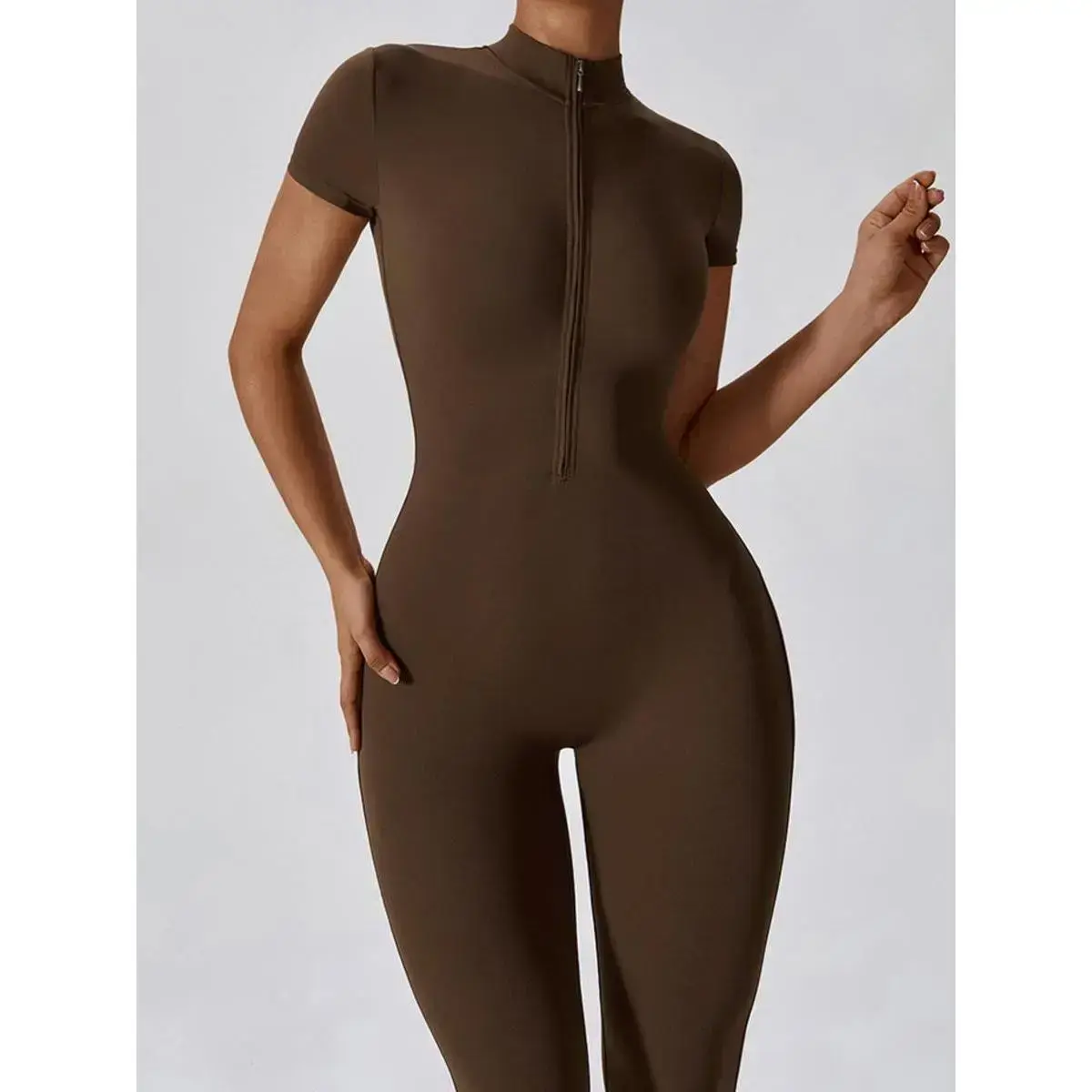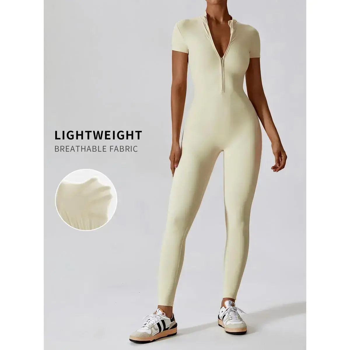 [Quick Drying Fabric]: Made with innovative quick-drying material, this jumpsuit ensures you stay dry and comfortable during intense yoga and gym workouts. [Zipper Closure]: Featuring a functional zipper at the mock neck, this jumpsuit allows for easy wear and provides a sleek look for various activities. [High Waist Fit]: The high waist design enhances support and emphasizes your silhouette, allowing for both performance and flattering shape during workouts. [Short Sleeve Coverage]: With short sleeves, this jumpsuit offers breathability and freedom of movement, ideal for warm weather training and casual outings. [Tight-fitting Cut]: The tight-fitting style guarantees a secure feel, maximizing your range of motion while ensuring the jumpsuit stays in place during exercise.