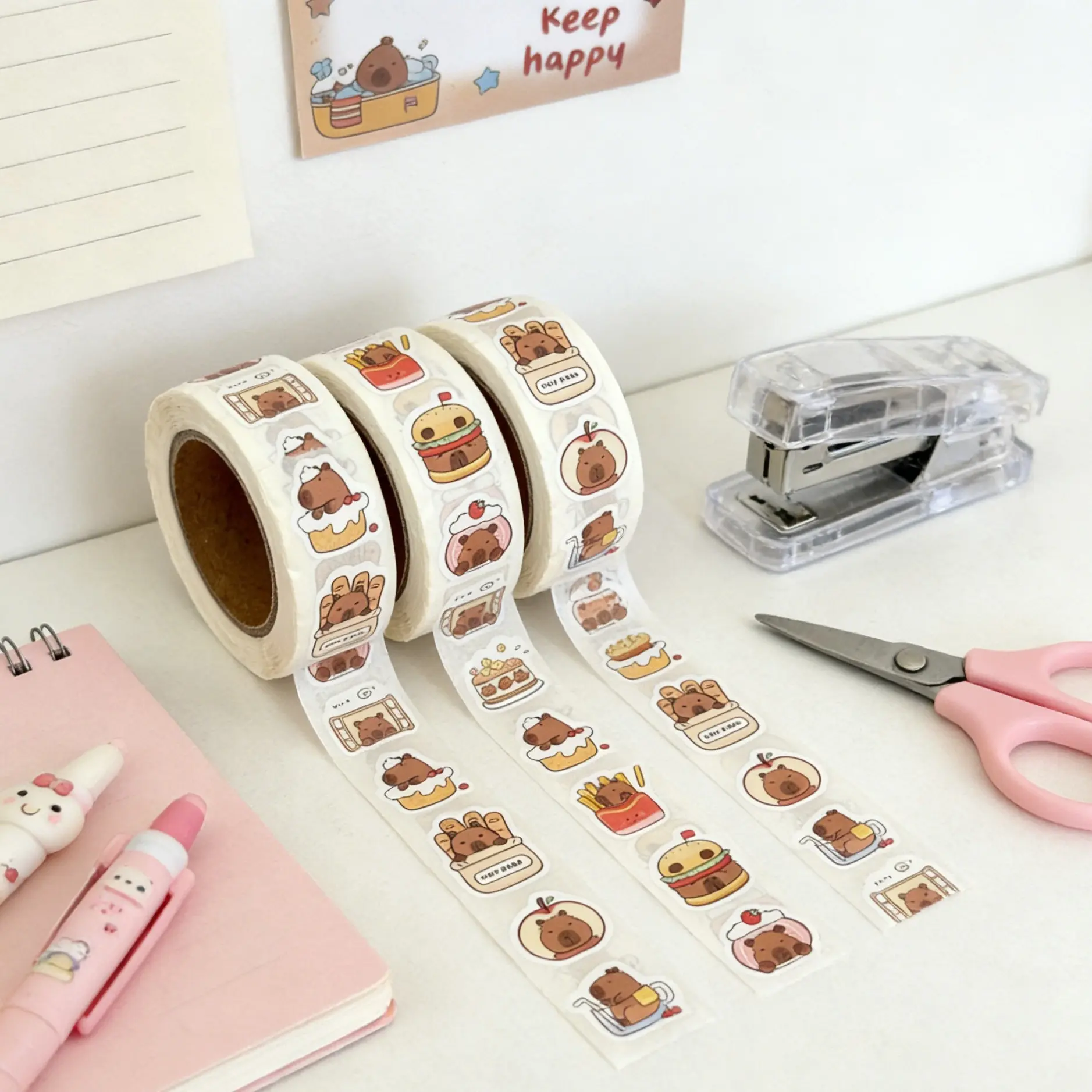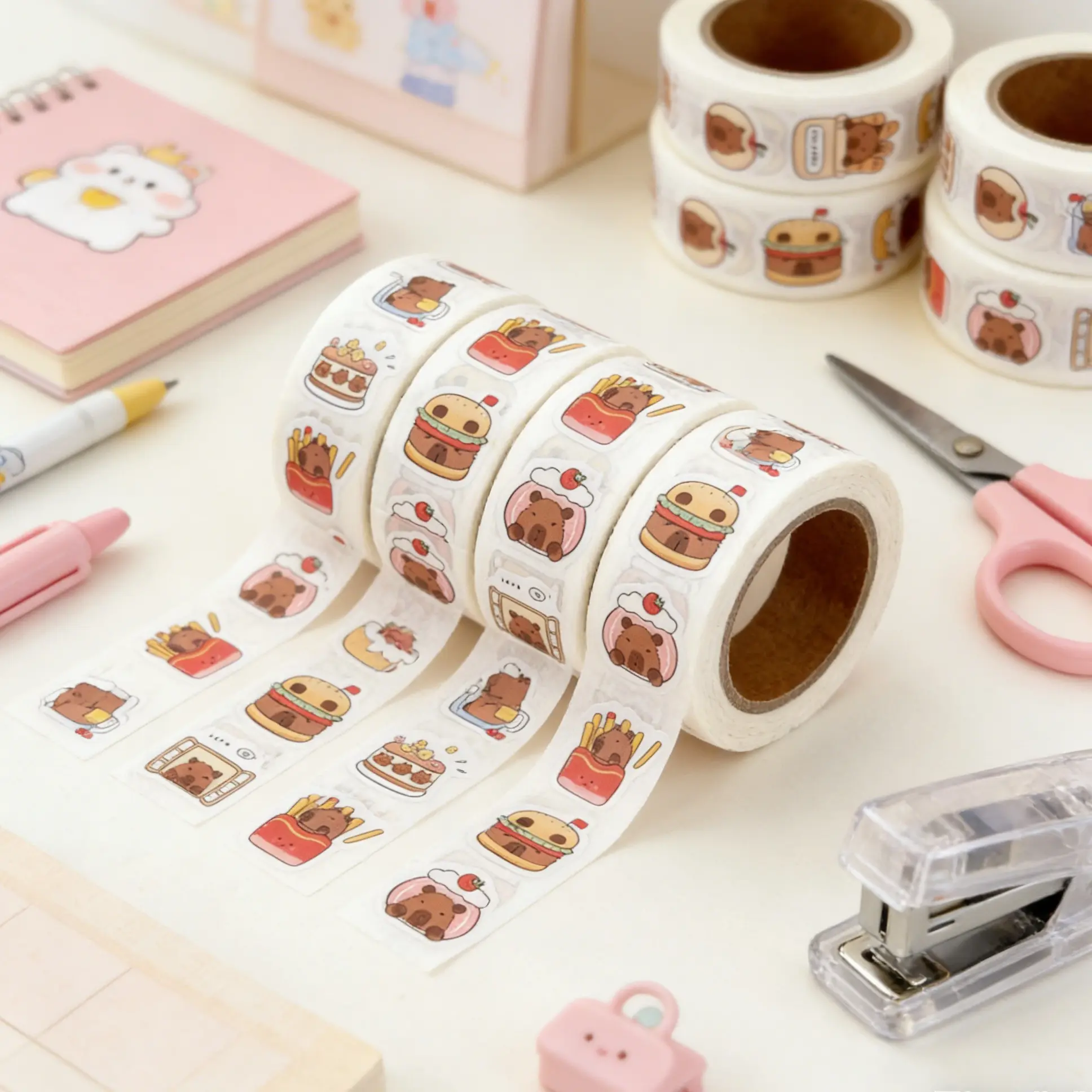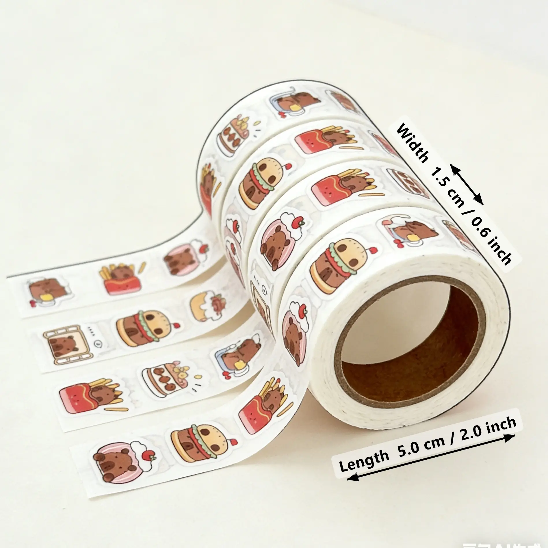 ·500 Cute Stickers Per Roll: Each roll contains 500 pre-cut, die-cut stickers featuring adorable capybaras in fun food-themed designs, including burgers, fries, cakes, toast, and more.