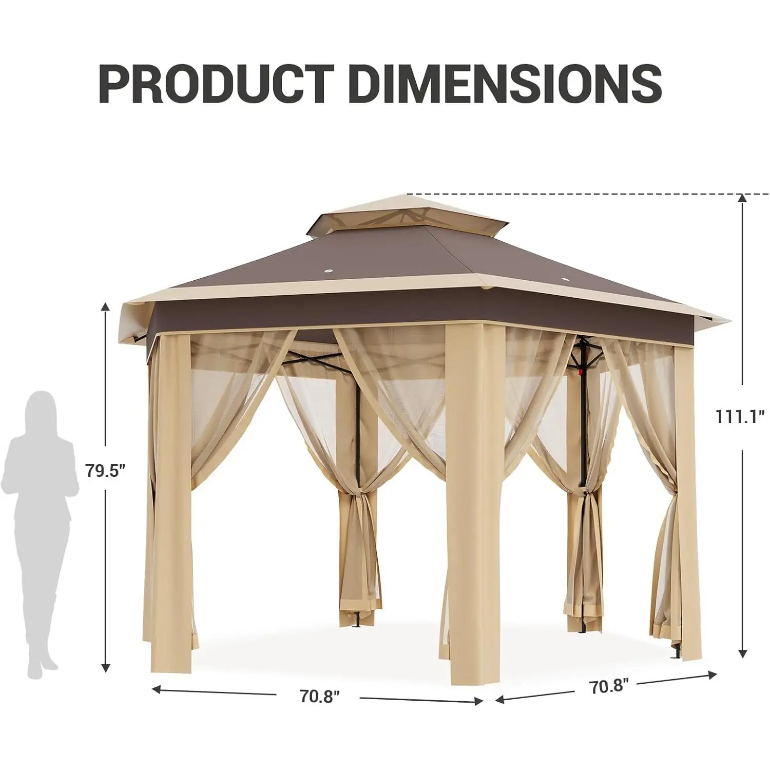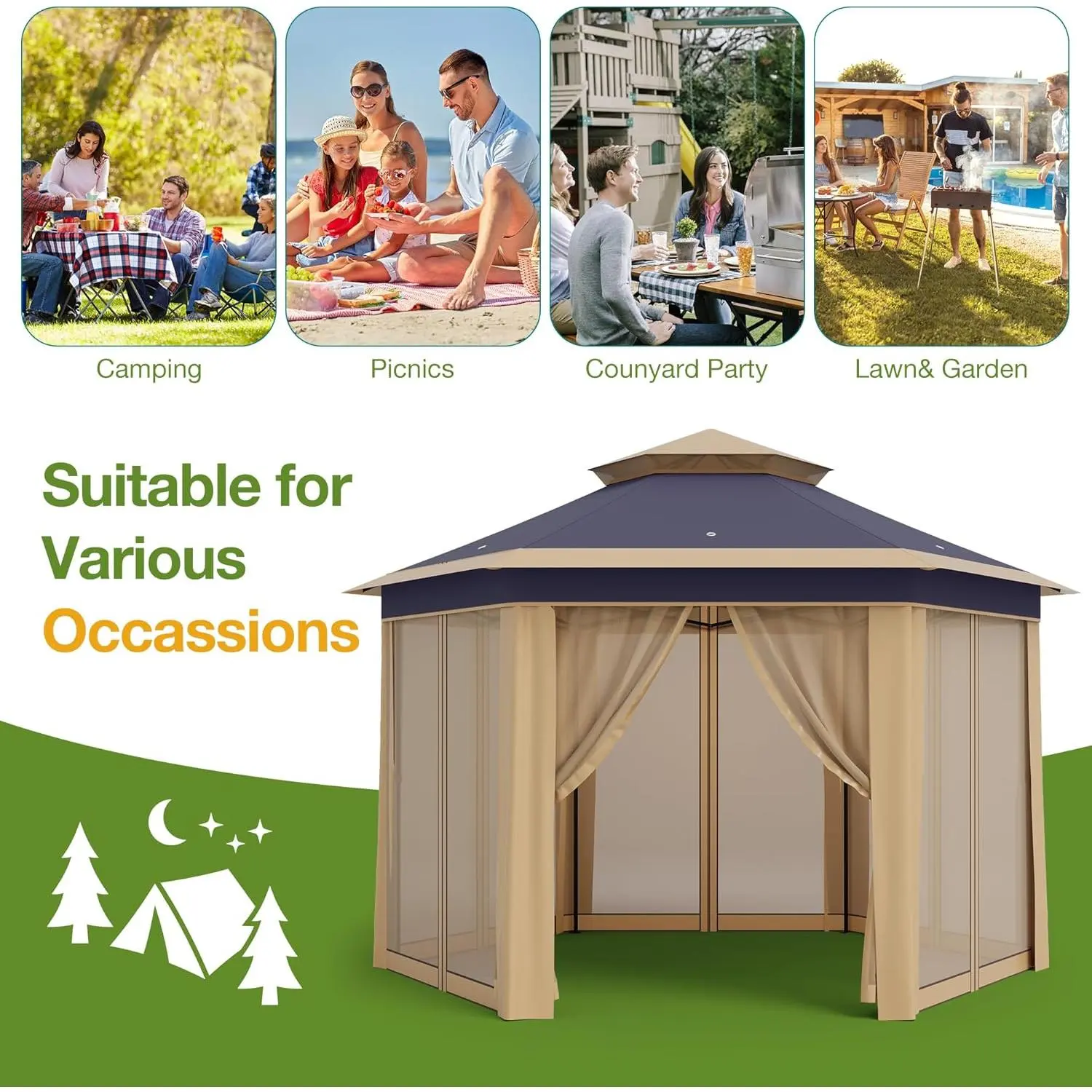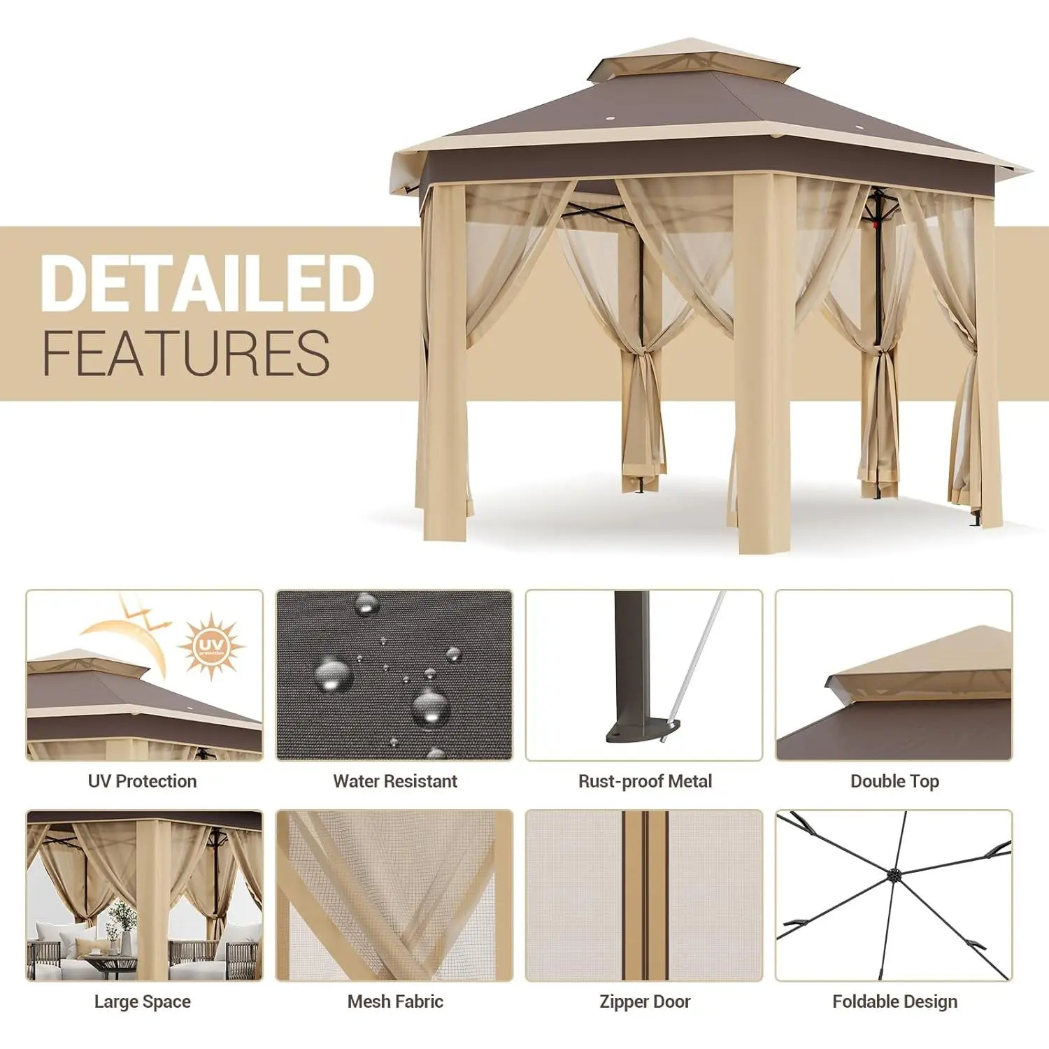 VEVOR Camping Gazebo Screen Tent, TikTokShopBlackFriday, 12*12ft, 6 Sided Pop-up Canopy Shelter Tent with Mesh Windows, Portable Carry Bag, Stakes, Large Shade Tents for Outdoor Camping, Lawn and Backyard, Brown/Beige