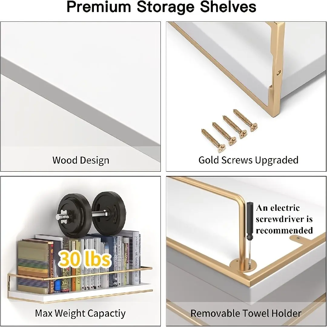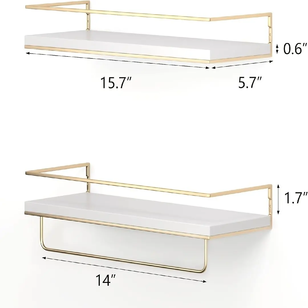 ·2 × White Floating Shelves with Gold Towel Bar