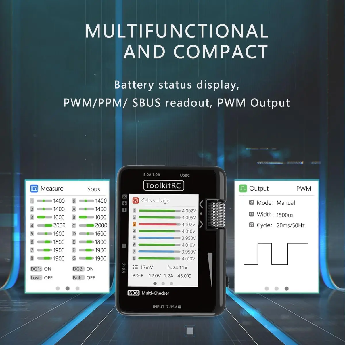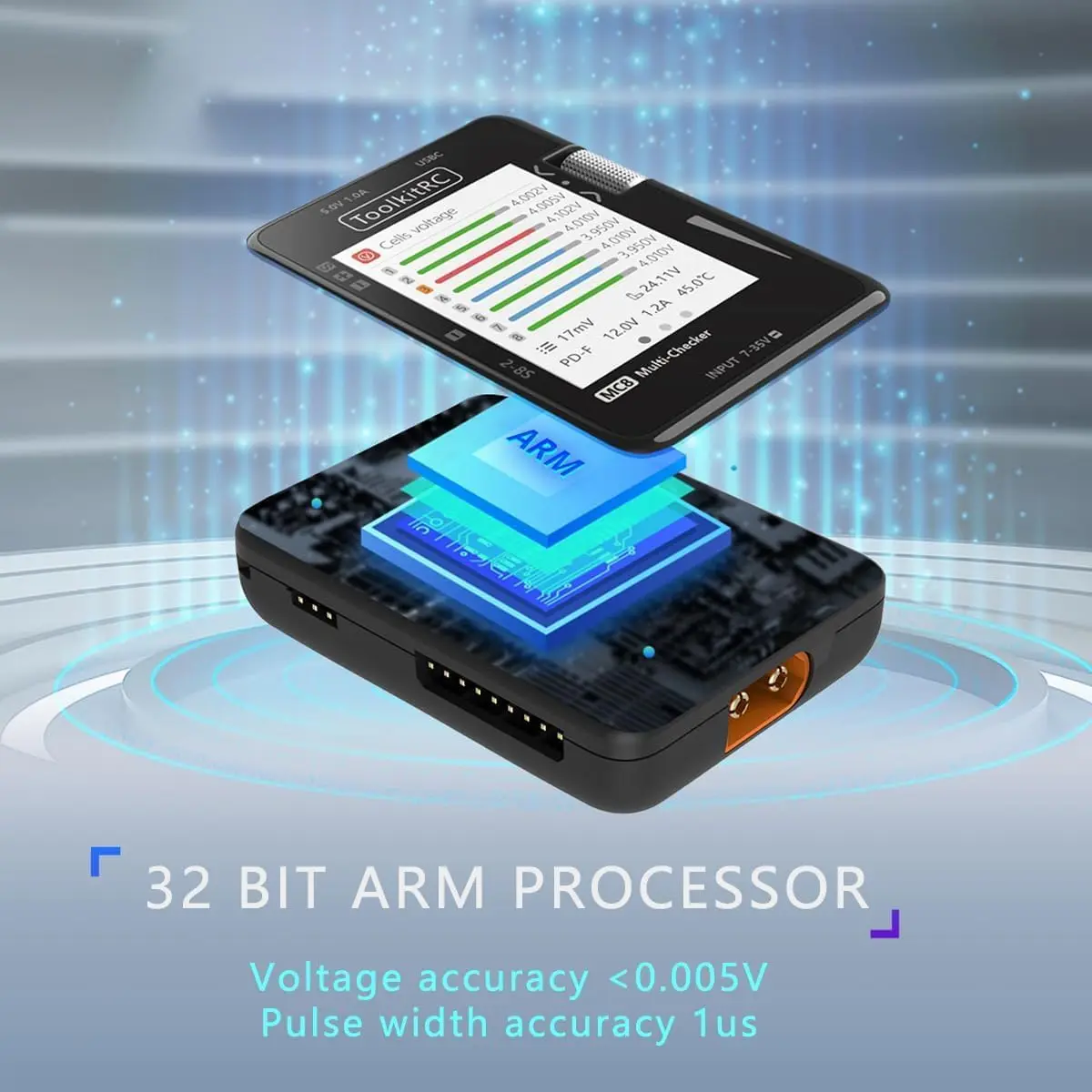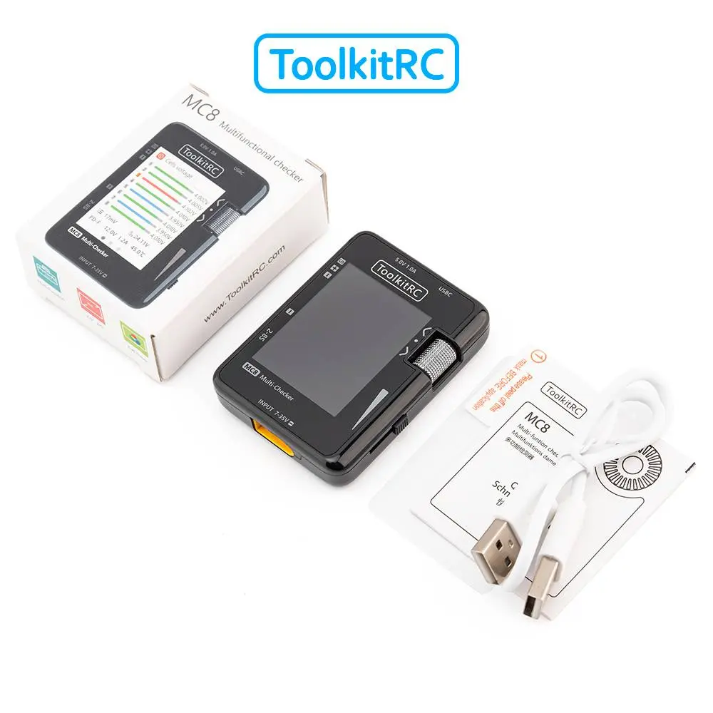 The ToolkitRC MC8 is a multifunctional intelligent detection device designed specifically for model airplane, FPV drone, and RC car players. It is equipped with a 32-bit ARM processor and features ultra-high precision, versatile functionality, and compact portability as its core. It is not only a battery status analyzer, but also a signal debugging tool, and an outdoor emergency charging treasure, making it a "versatile detection tool" for outdoor flying fields for model enthusiasts.