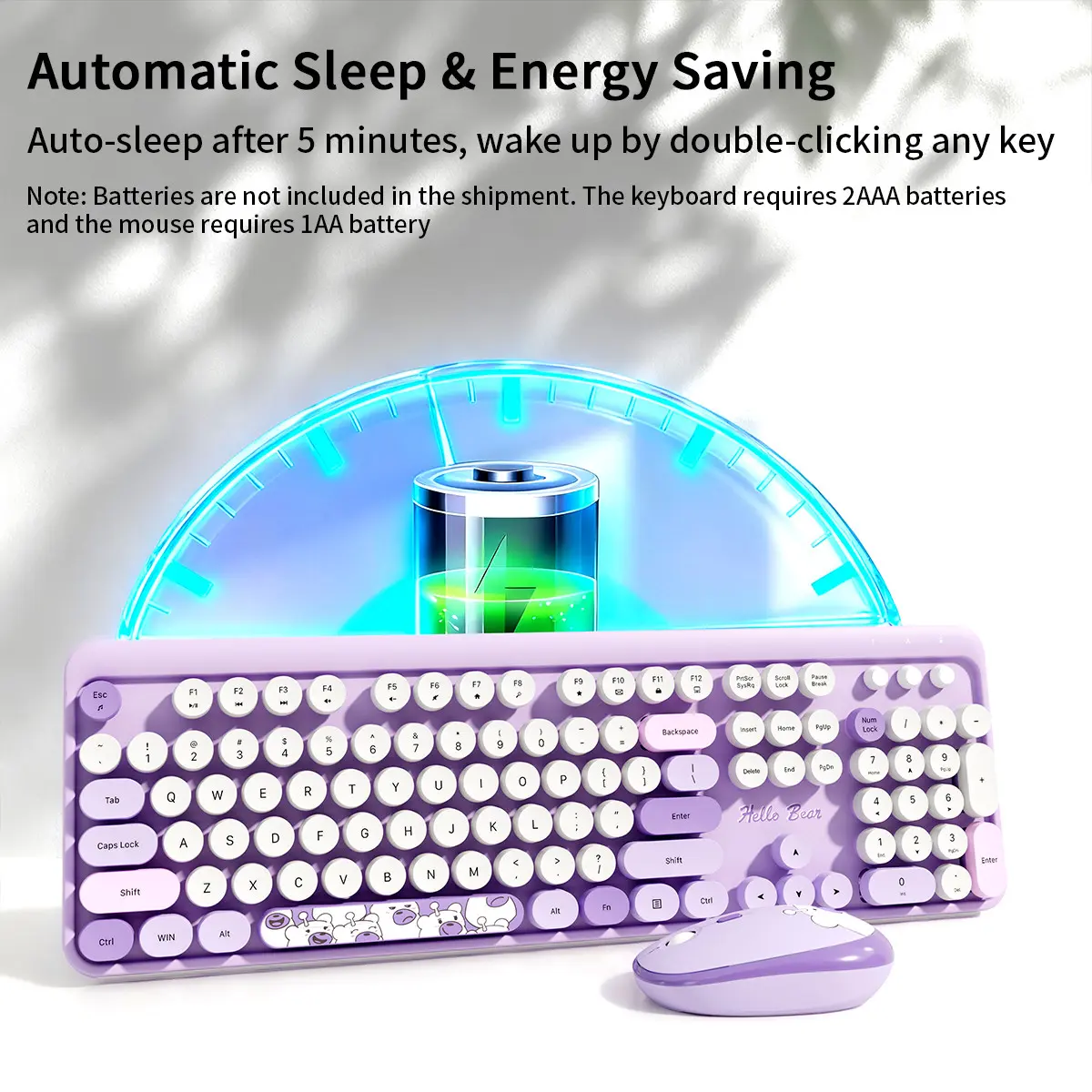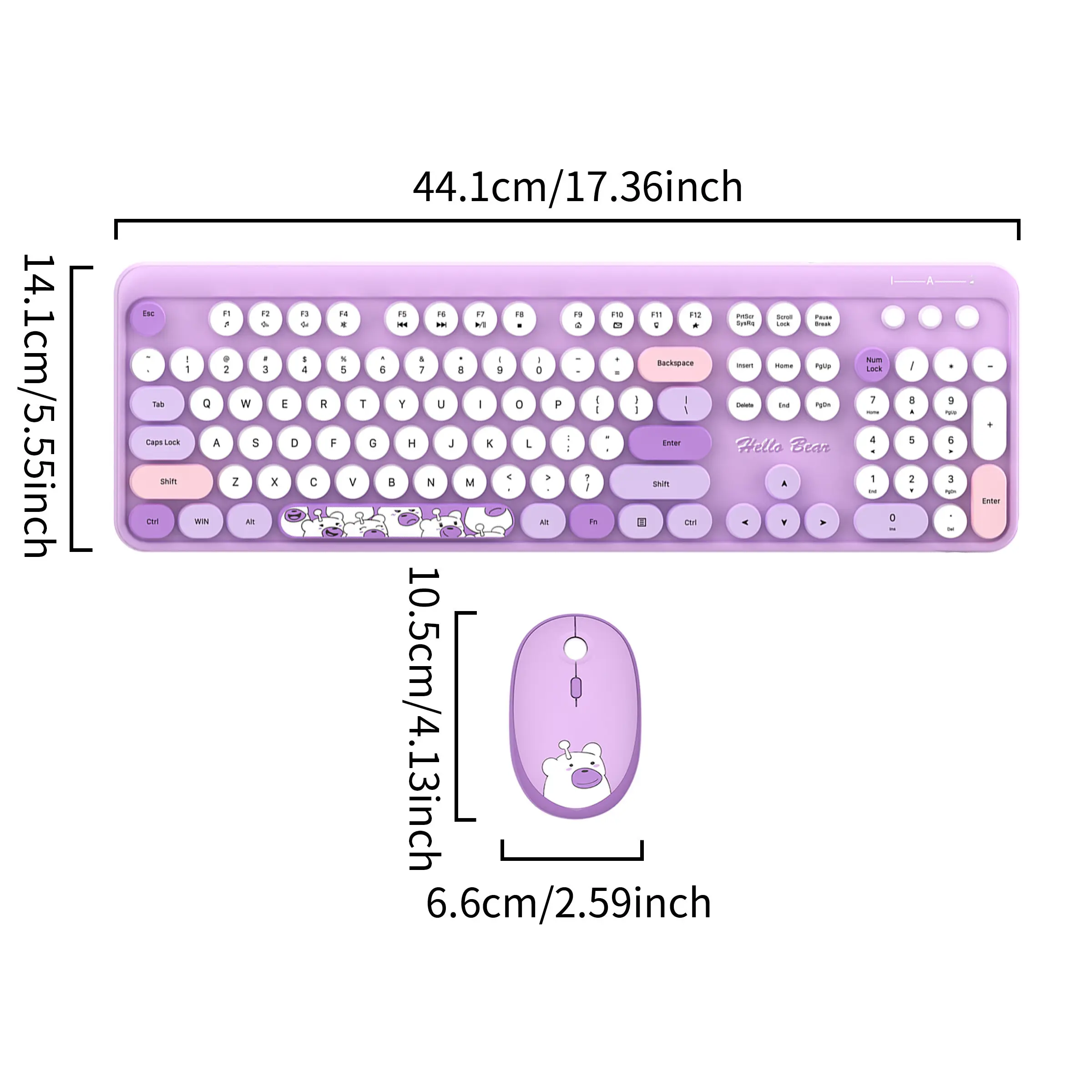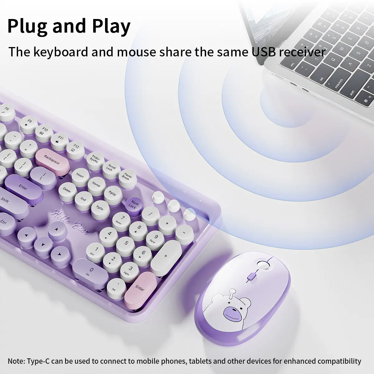 MOFii 1 Set Wireless Keyboard and Mouse Combo, Purple Cute Bear Round Keycaps, High-Appearance Office Keyboard Mouse for Girls, Universal for Laptop and Desktop, US Qwerty (Batteries Not Included)