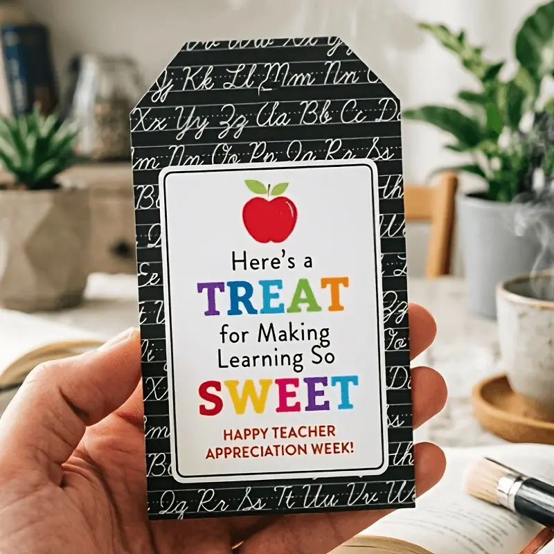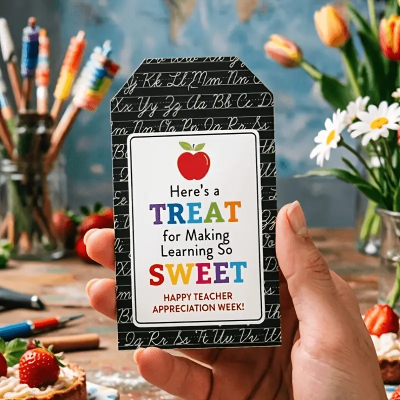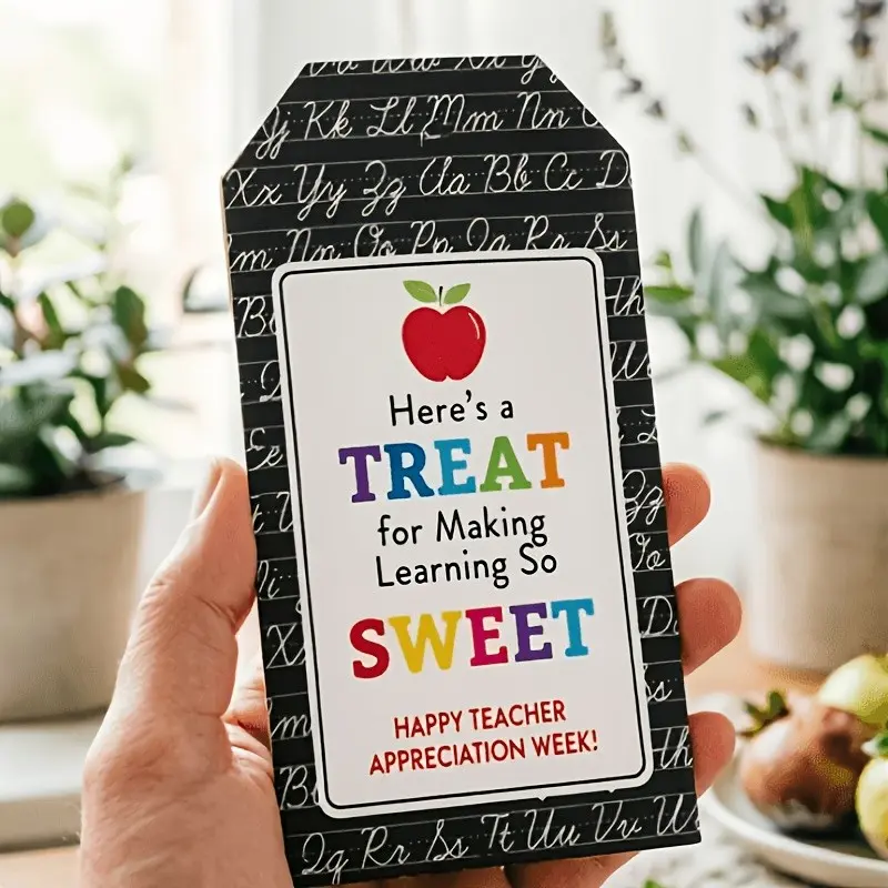20 Pcs Happy Teacher Appreciation Week Gift Tags, Colorful Graffiti Font, Rainbow Letters, Blackboard Style, Apple Design