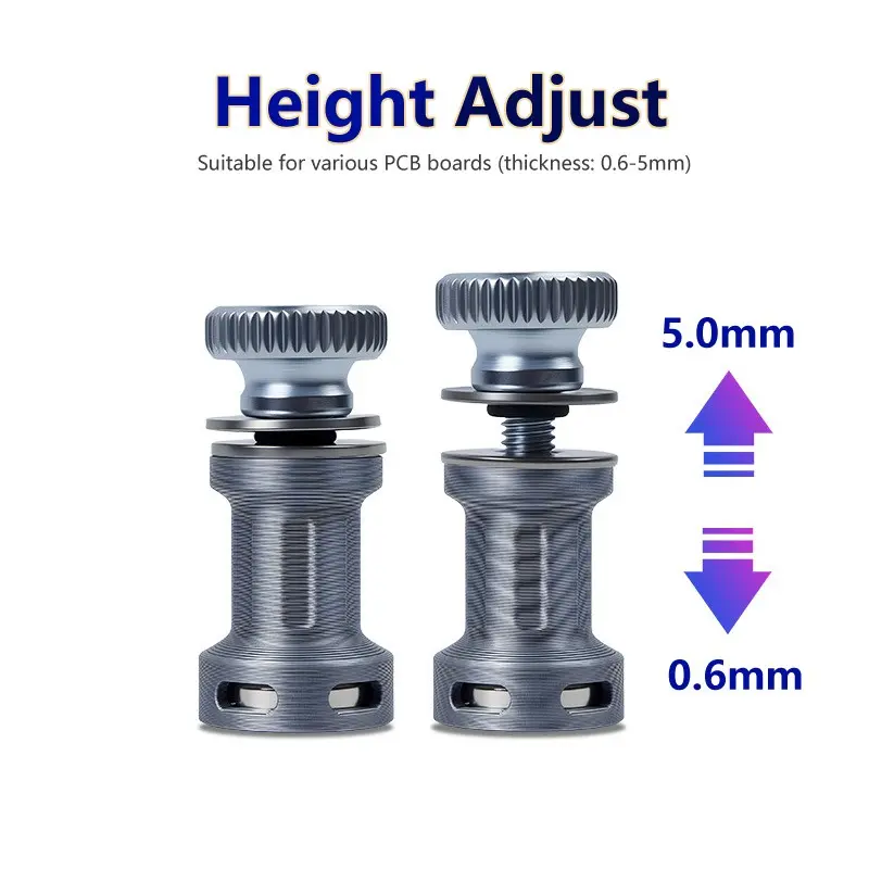 ·Magnetic Positioning Pins for Flexible Fixing of Various PCB Sizes: The fixture is equipped with multiple sets of magnetic positioning pins (silver, blue, gold, etc.), which can be freely adjusted in spacing and angle to adapt to various PCBs, from tiny microcontrollers to large motherboards. The magnetic adsorption design ensures the pins are stable and immovable, while also supporting quick removal, allowing for the installation and replacement of circuit boards without any tools.