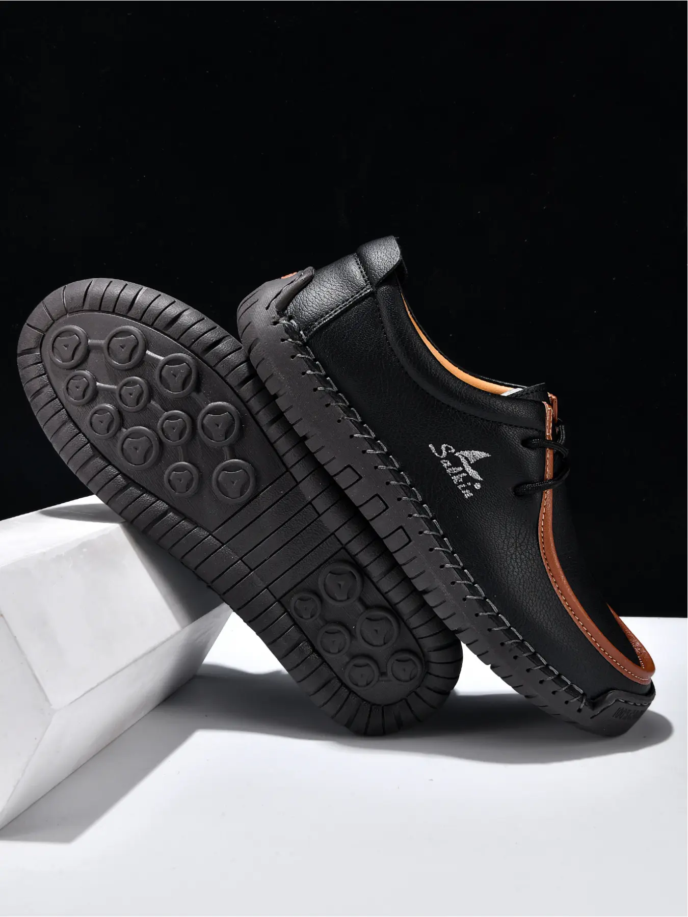 Men's Black Hand-Stitched Casual Shoes, Soft Sole Non-Slip Slip-On Driving Shoes, Dad Shoes