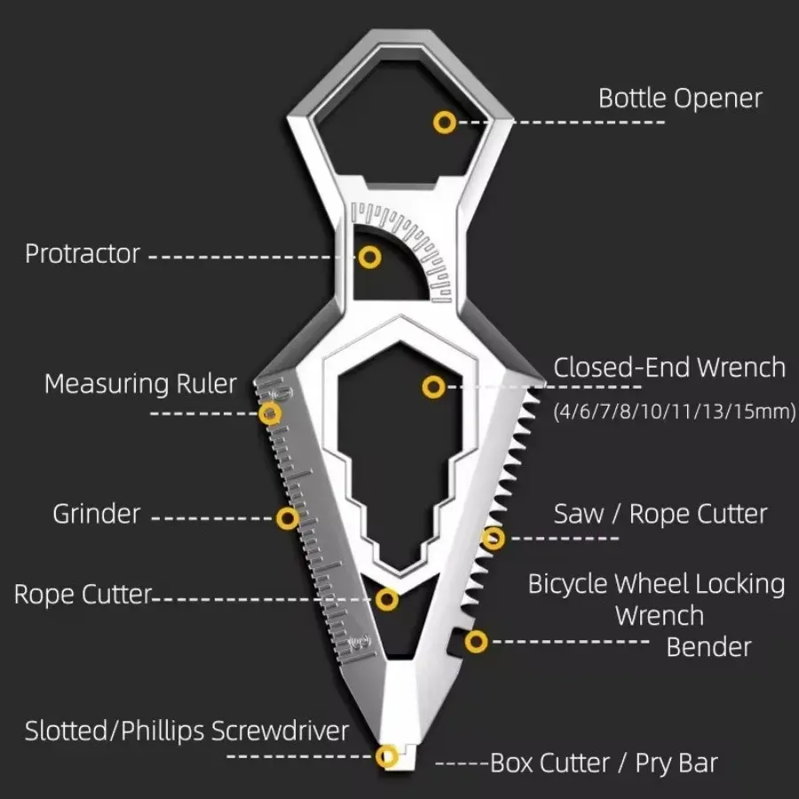 【Multi-functional tool】: This 9-in-1 keychain combines bottle opener, protractor, ruler, screwdriver, wrench, and more for versatility.