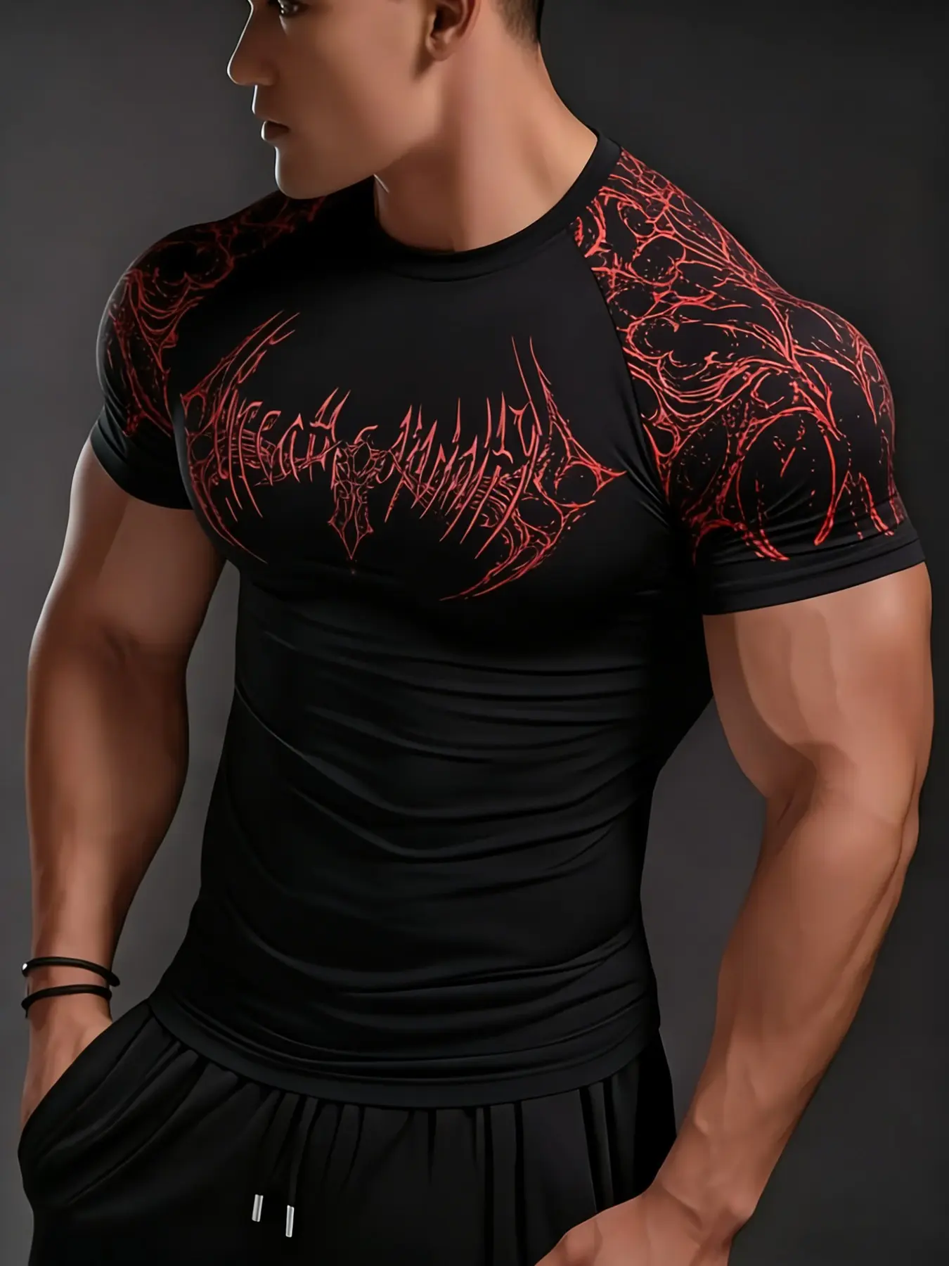 Men's High Elastic Quick-Dry Flame Print Sport T-Shirt, Slim Fit Breathable Short Sleeve, Muscle Training Running Workout Top