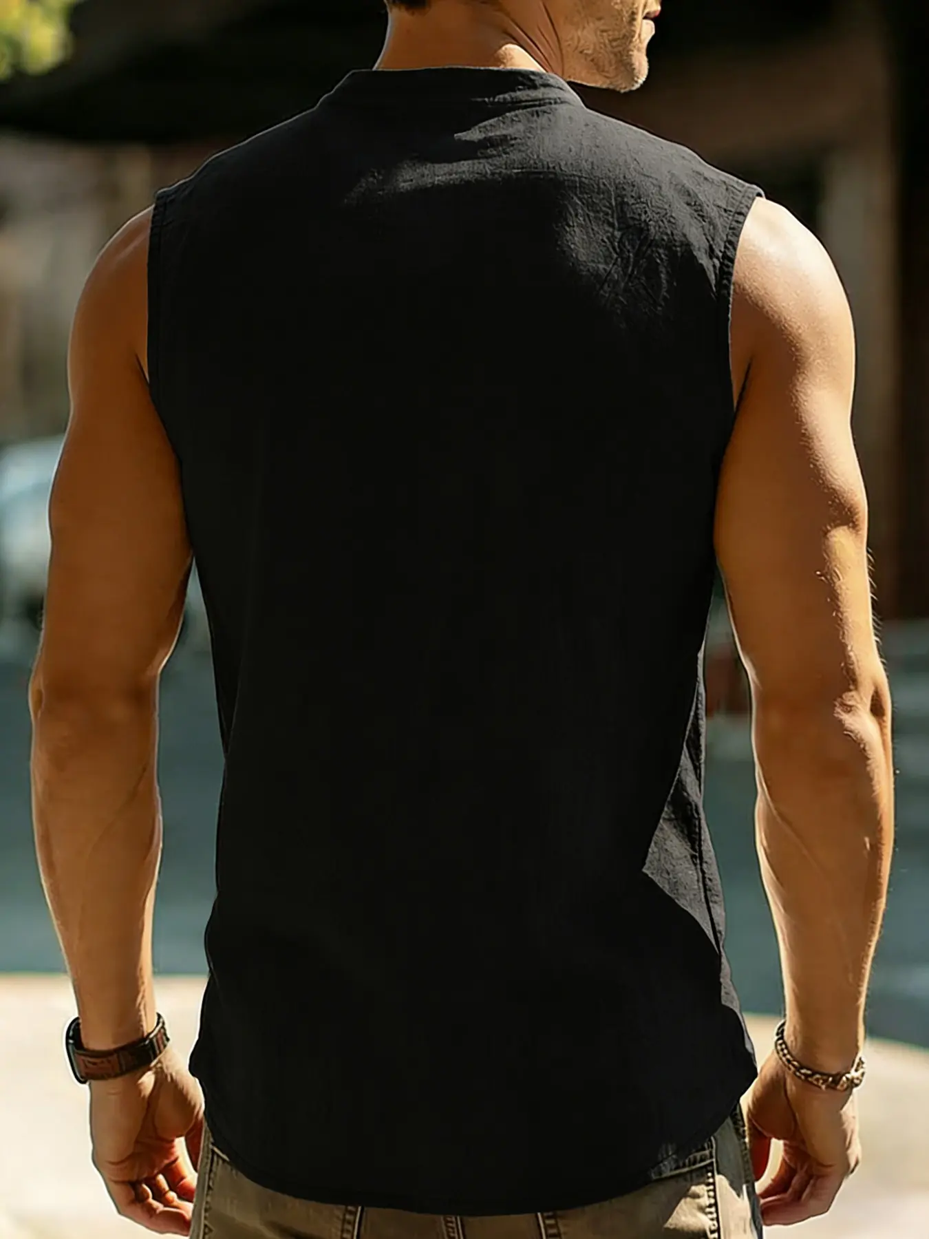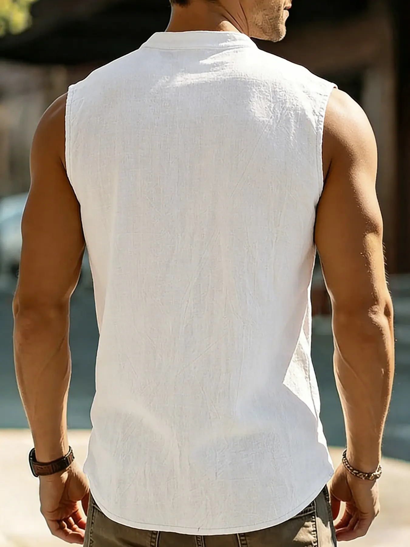 Men's Stand Collar Sleeveless Linen Shirt, Breathable Cotton-Linen Loose Fit, European Style Beach Vacation Casual Top