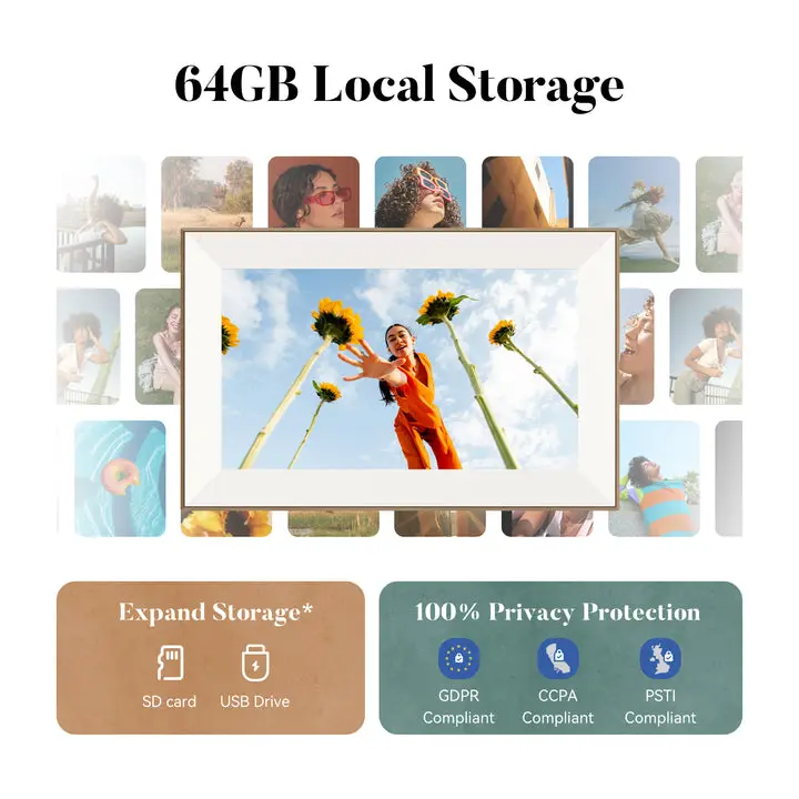 Dual orientation for portrait and landscape, display even offline 64GB internal storage, supports SD card or USB drive for expanded storage