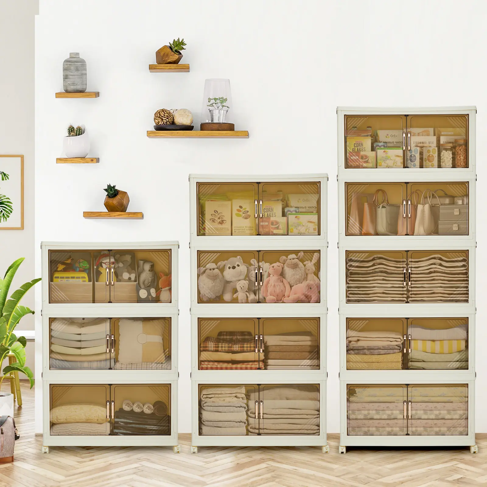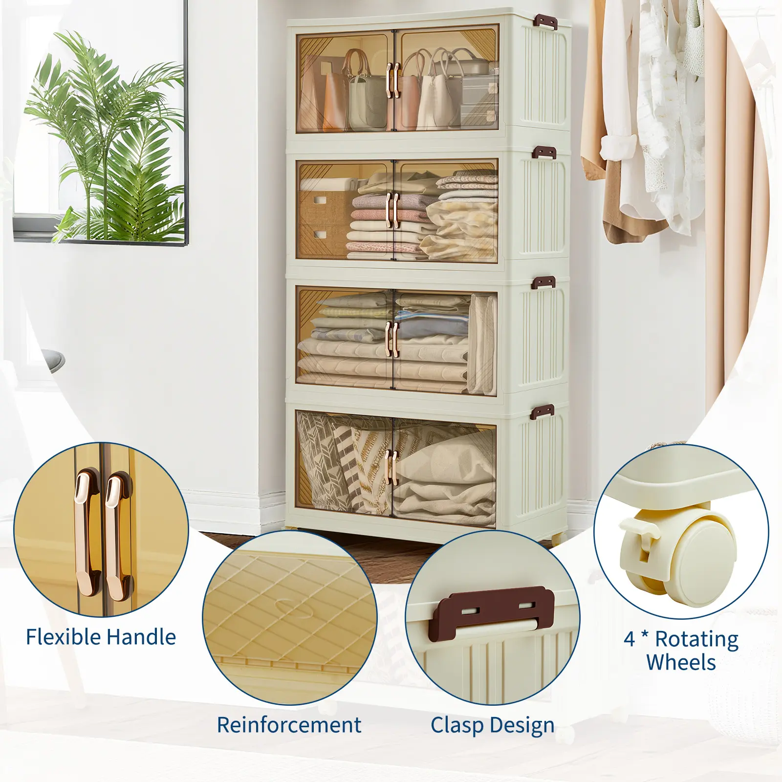 OUTGOODS Stackable Plastic Storage Bin with Lid – Collapsible Drawer Organizer, Magnetic Doors & Wheels, Collapsible for Bedroom, Closet, Dorm, Office – Translucent
