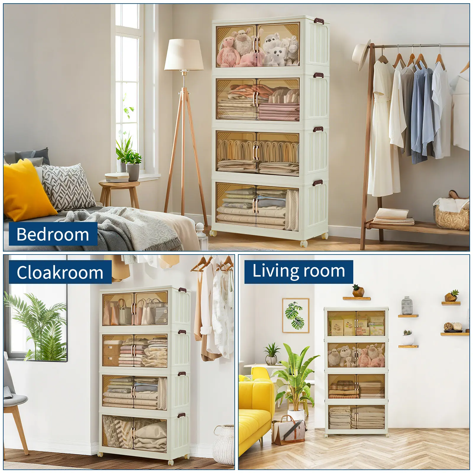 Features front-opening magnetic doors and a top lid for easy access. The transparent brown door allows quick visibility of contents, while built-in magnets keep doors securely closed. Equipped with 4 smooth 360-degree swivel wheels with locking function for easy movement and stability.