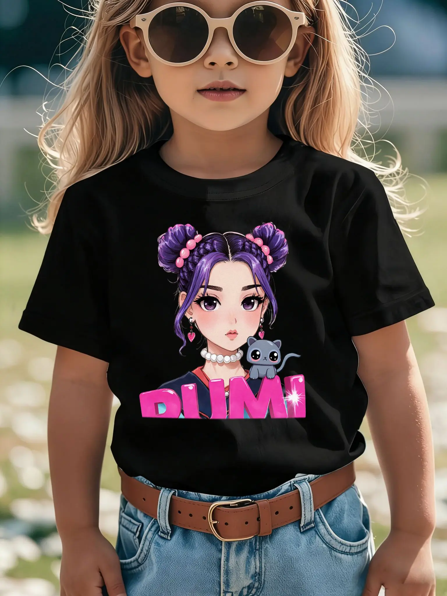 PUMI Anime Character White T-Shirt for Kids Girls - Cute Purple Hair Twin Buns Gray Cat Graphic Print Tee with Bold Pink Sparkle Letters - Soft Casual Crew Neck Summer Breathable Top - Trendy Youth Daily Wear Fashion Outfit - Perfect Birthda