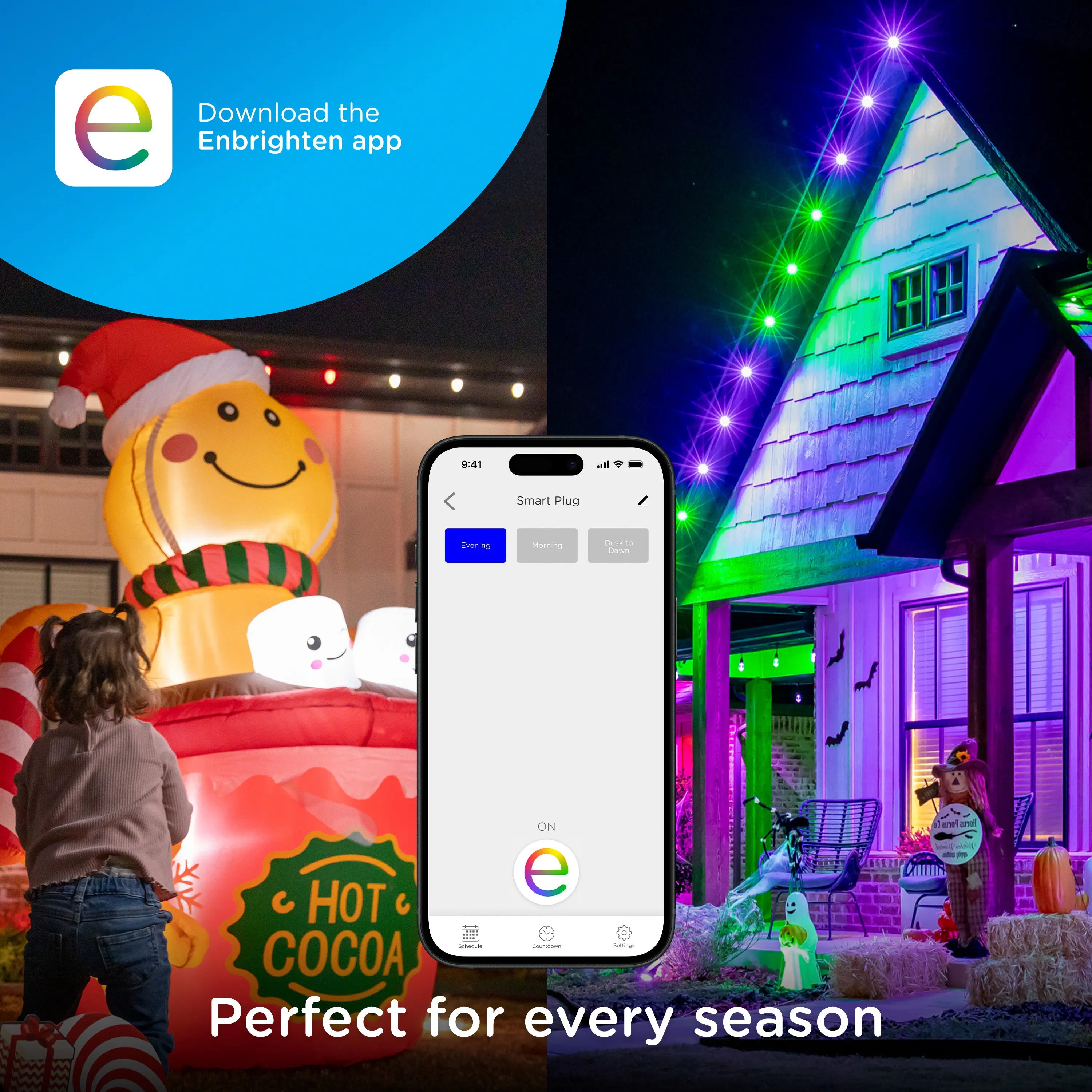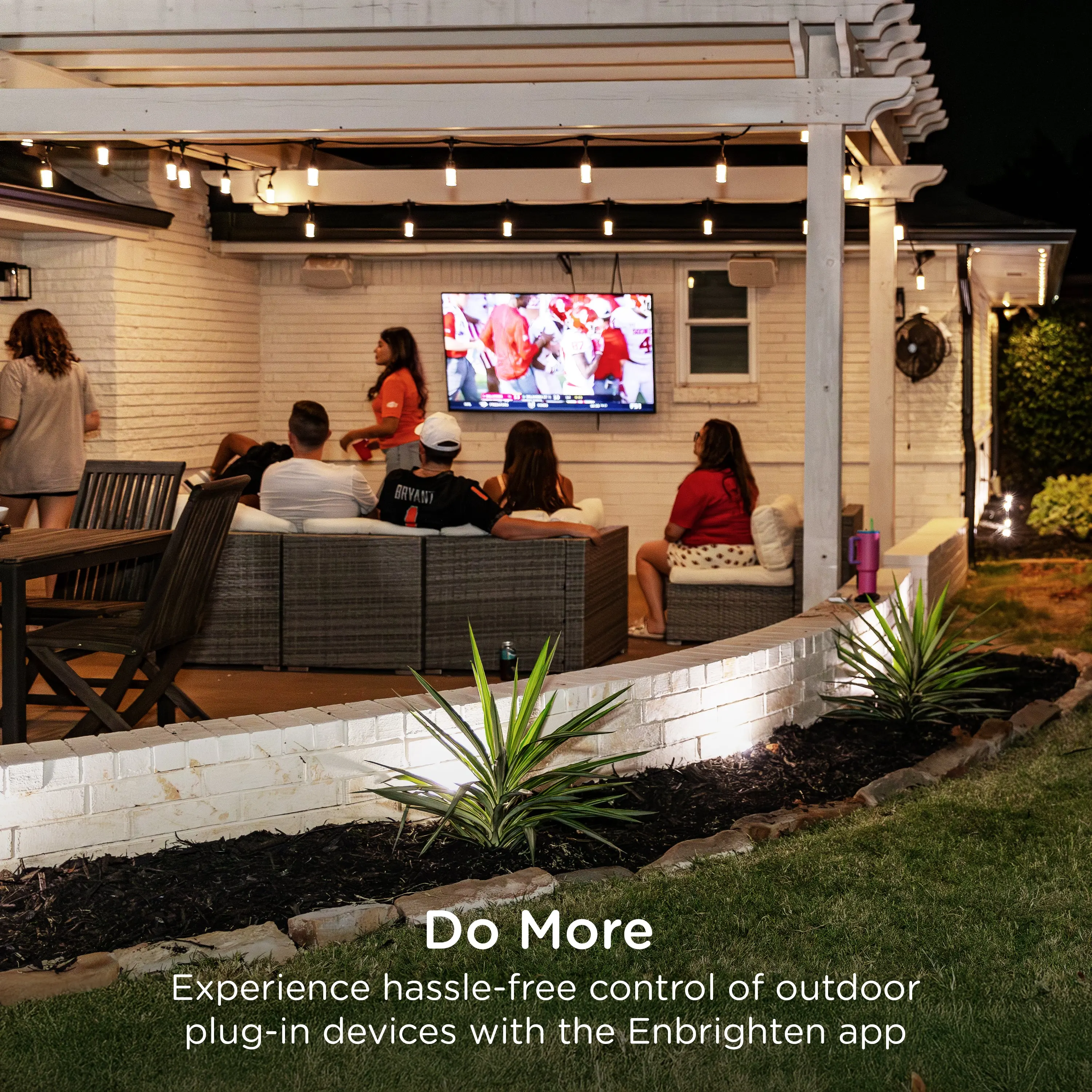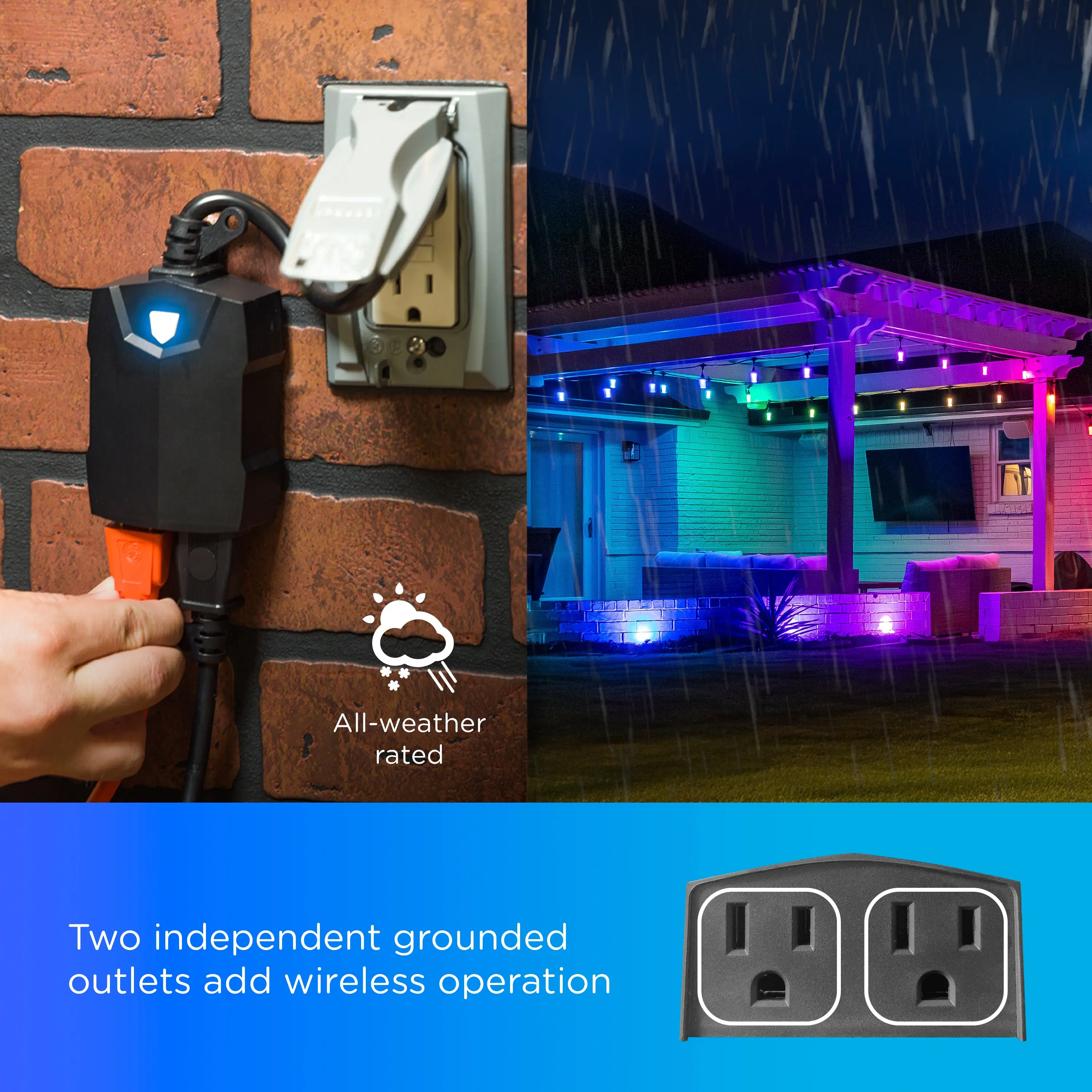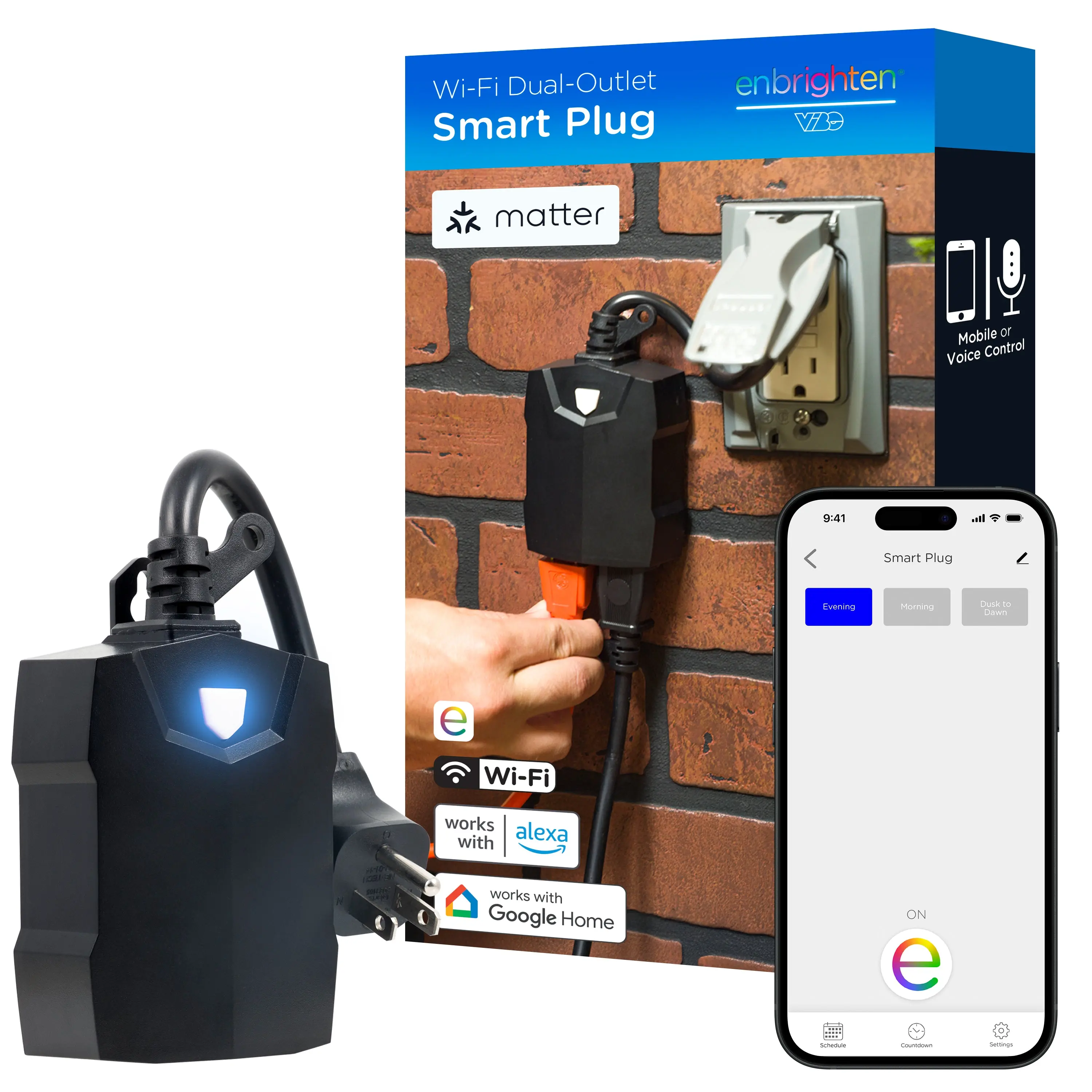 Have life at your fingertips with the Enbrighten VIBE Wi-Fi Dual-Outlet Smart Plug. Why pick an ordinary outlet for your plug-in device when you can control it from anywhere? The smart plug offers unique scheduling, automation and mobile commands through the user-friendly Enbrighten app. Your options for a simple smart home are endless. It is directly compatible with Amazon Alexa and Google Assistant without any extra equipment for hassle-free voice control. To further blend into your lifestyle, the smart plug is compatible with any Matter-equipped device. Connect in an instant to experience the joys of automation. The compact plug-in design of the smart switch means complicated wiring isn’t required, and the ergonomic design of the cord easily unplugs and better fits weatherproof boxes. Two independently controlled grounded outlets support your favorite outdoor products with three-prong plugs. It’s perfect for upgrading landscape lights, small water features, café lights, fans, holiday décor and more. Enhance your operation through the Enbrighten VIBE Wi-Fi Dual-Outlet Smart Plug.