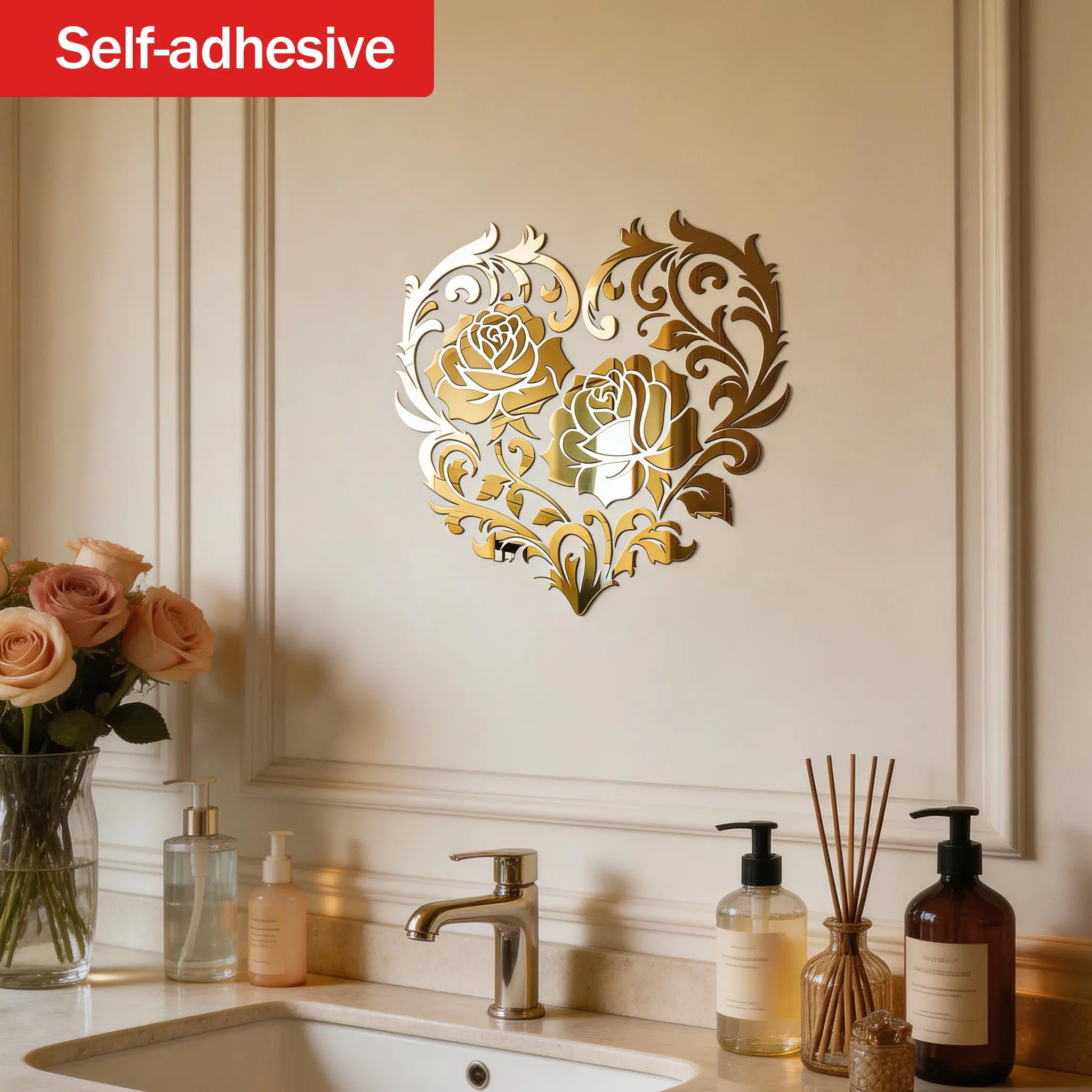 Mirror Rose Heart Art Self-Adhesive Wall Hanging Makeup Mirror, Romantic Decorative Wall Mirror for Living Room Bedroom, Luxury Atmosphere