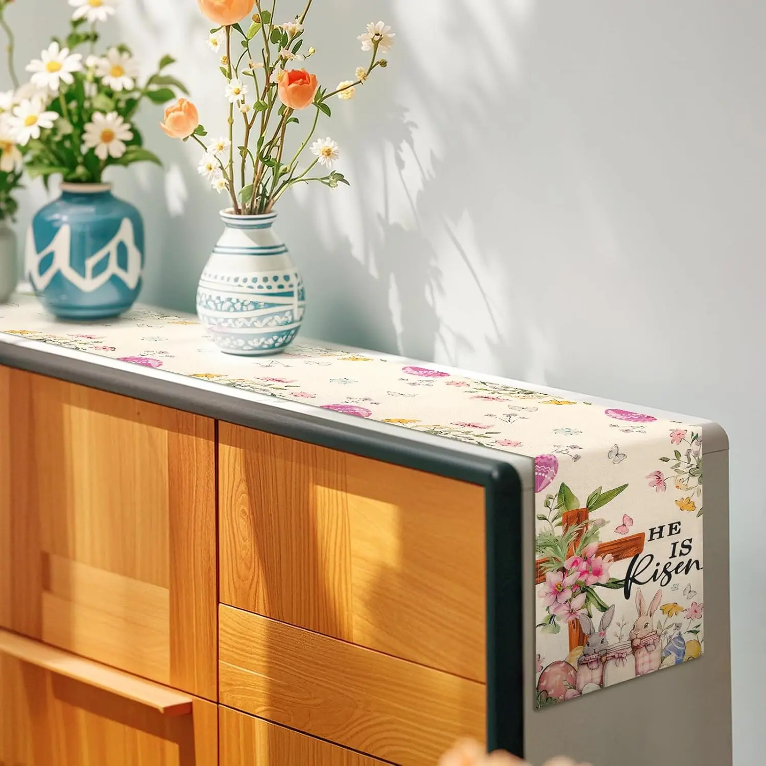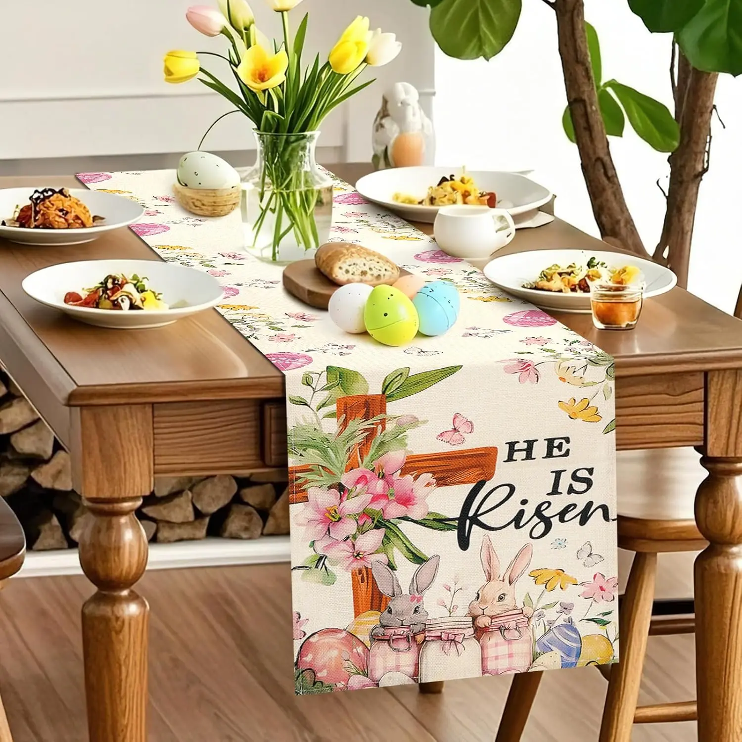 Easter Table Runner 13*72 Inch, Easter Decorations for Table Decor, Bunny Table Runner with Cross Flower, He is Risen Decors Spring Kitchen Dining Table Decor for Home