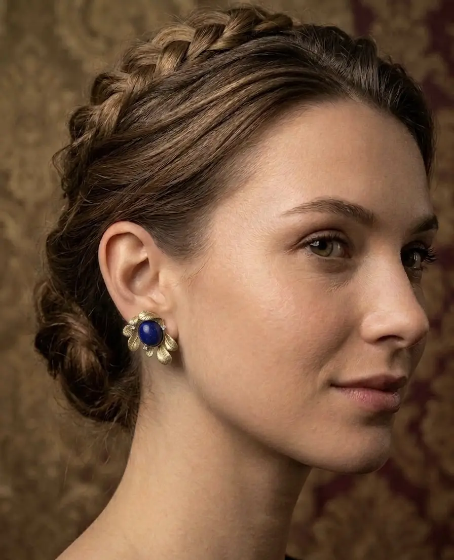 Product full name:Brass-plated vintage embossed rhinestone deep blue natural stone stud earrings