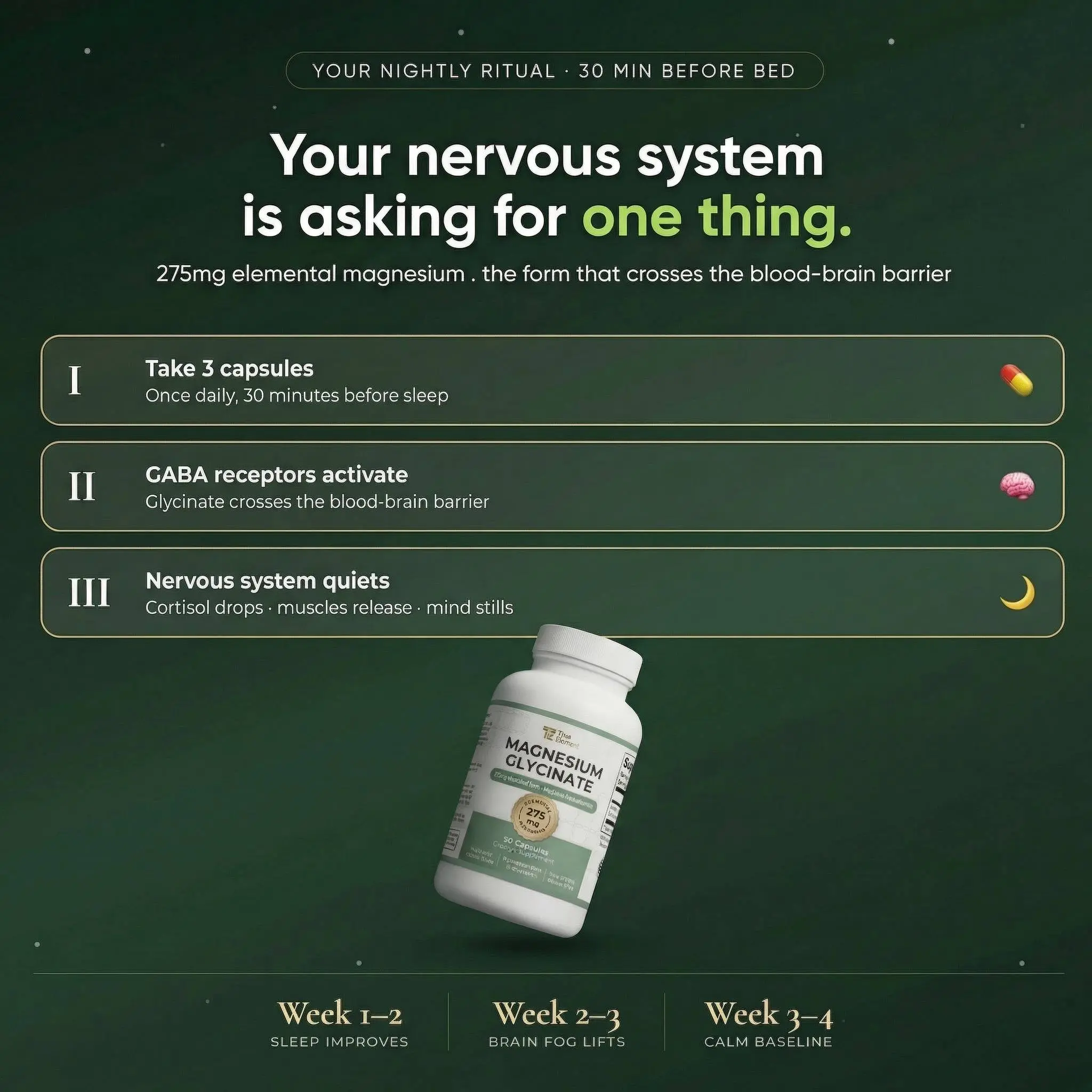 ·Magnesium glycinate is the most bioavailable and stomach-friendly form of magnesium available. Unlike cheaper forms like oxide or citrate, glycinate is fully chelated — meaning the magnesium is bonded to glycine for maximum absorption and zero digestive discomfort. Your body gets more. Your stomach notices nothing.