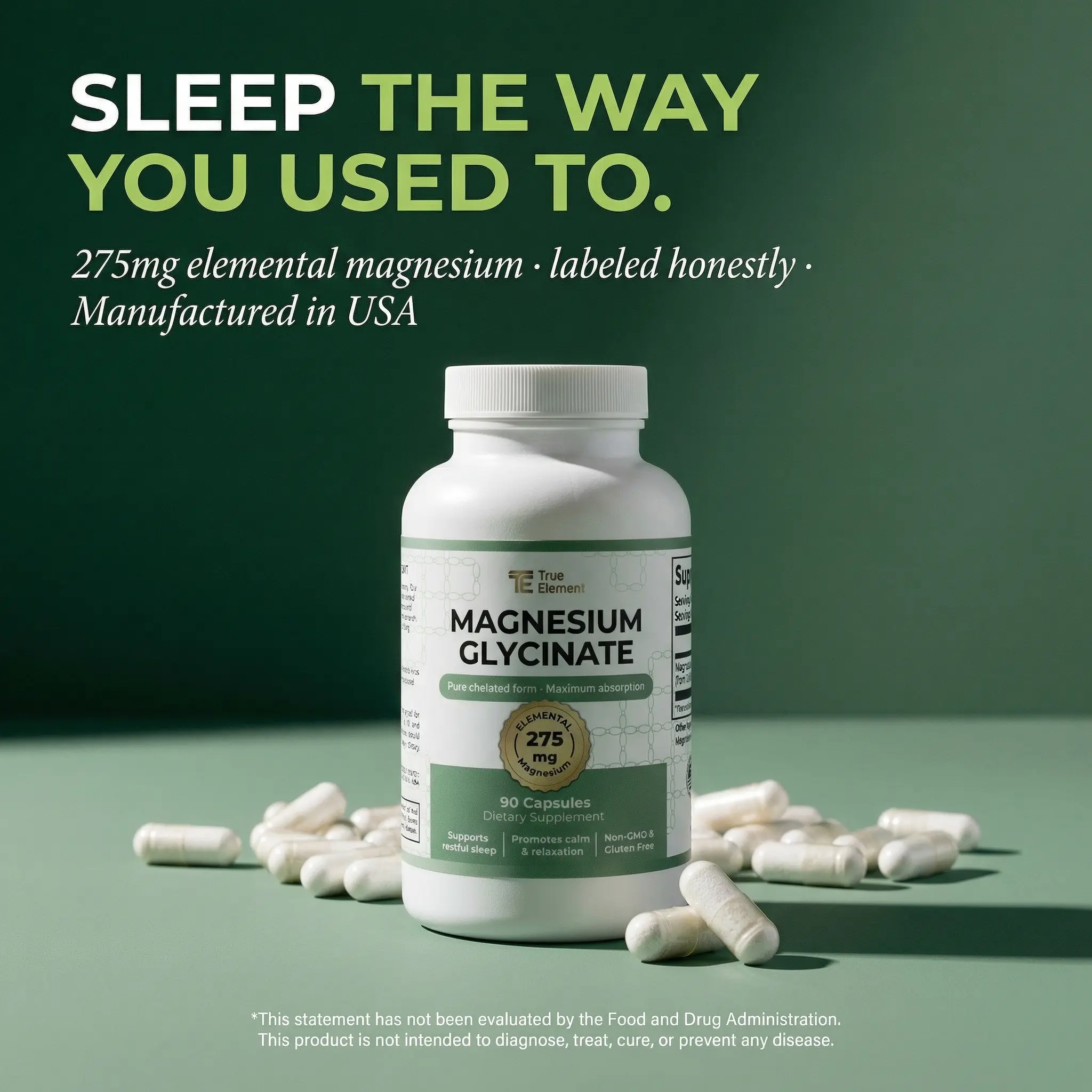 ·275mg elemental magnesium per serving. Not compound weight. Not a marketing number. The actual magnesium your body receives — from 2,500mg of pure magnesium glycinate. We disclose both numbers because most brands don't. Now you know why.