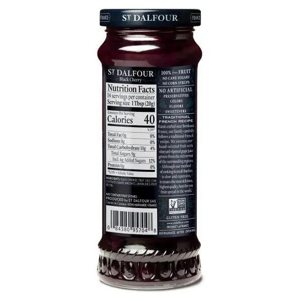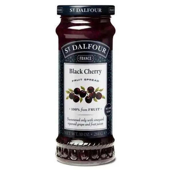 All natural ingredients. 100% fruit. An old French recipe. No cane sugar. A delicious fruit spread made in France by an old recipe. Black cherries sweetened only with grape juice concentrate. For a superb taste mix fruit on top down into jar. By gently cooking in the tradition of the French countryside, the natural flavor of the fruit is conserved. No preservatives. No artificial flavors or colors. All natural ingredients.
