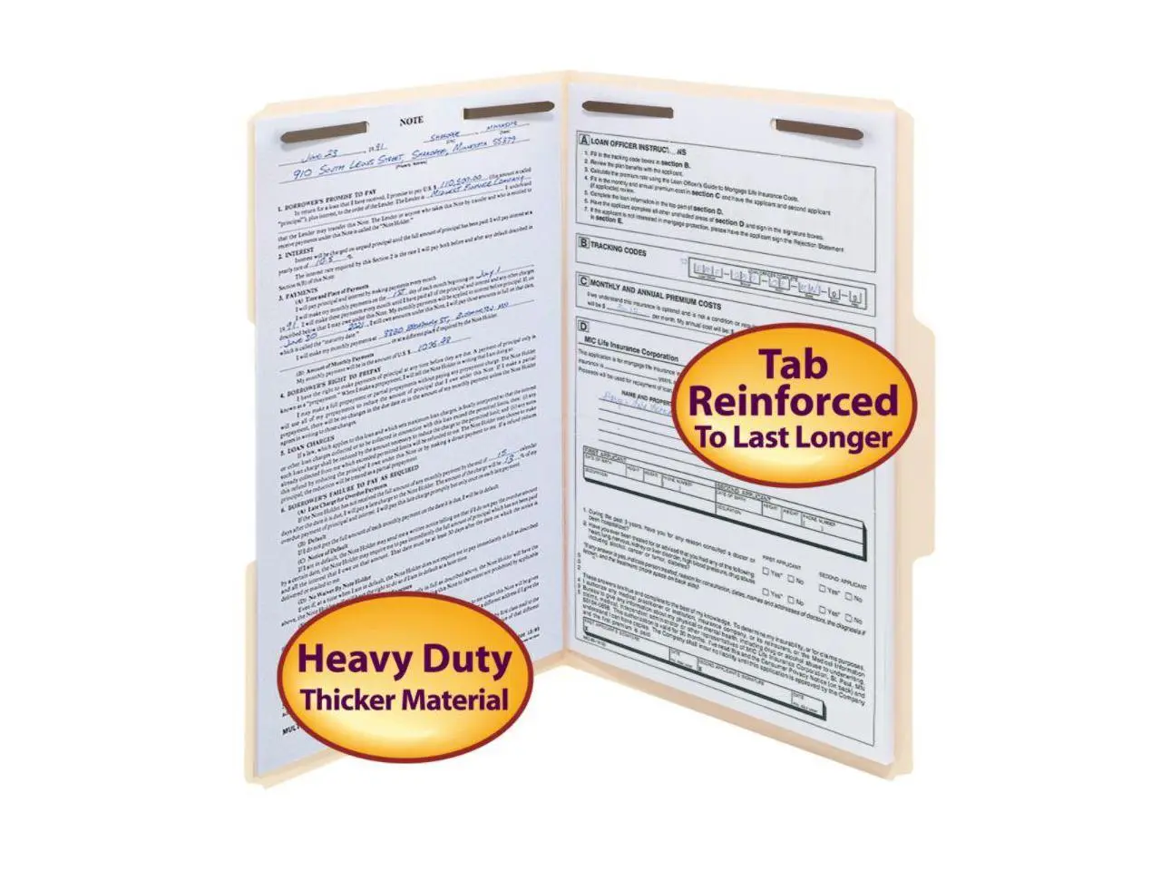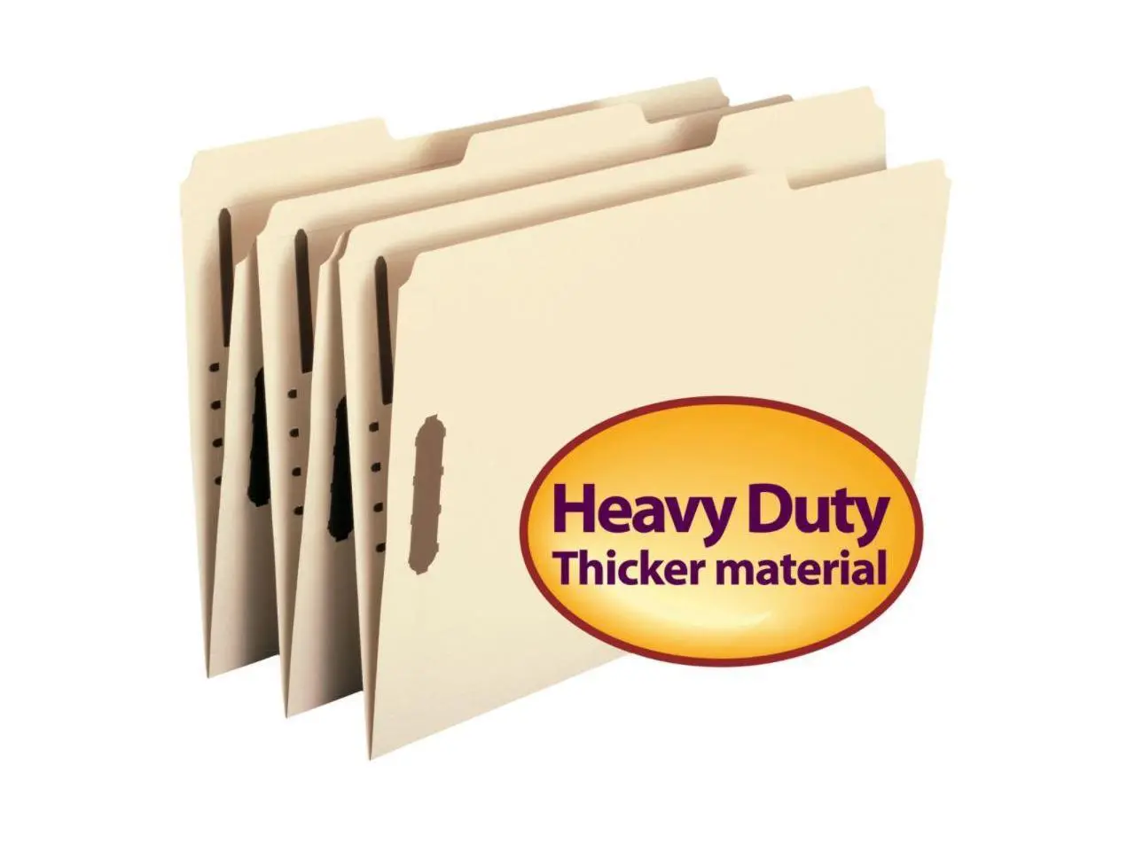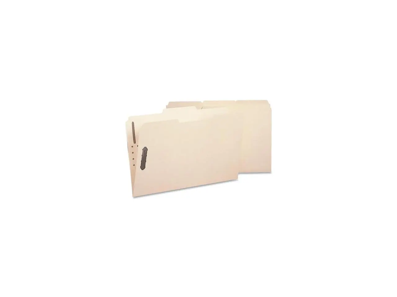 Smead Heavy-Duty Manila Fastener Folders - Legal - 8 1/2" x 14" Sheet Size - 2 Fastener (s) - 1/3 Tab Cut - Assorted Position Tab Location - 18 pt. Folder Thickness - Manila - Recycled - 50 / Box - Heavy-duty fastener folders feature a thicker paper stock that will stand up to the challenges of frequent or long-term use. Two fasteners per folder provide two separate filing surfaces and a secure way to organize your documents. 1/3-cut tabs are in assorted positions for easy access. Fastener folders are scored for 3/4" expansion and are made of 18 point manila stock.