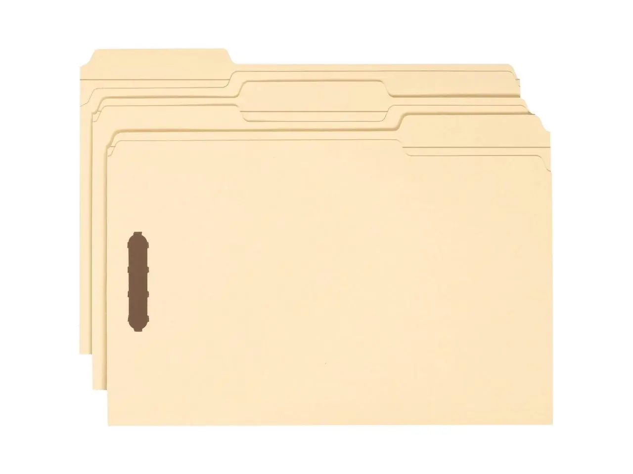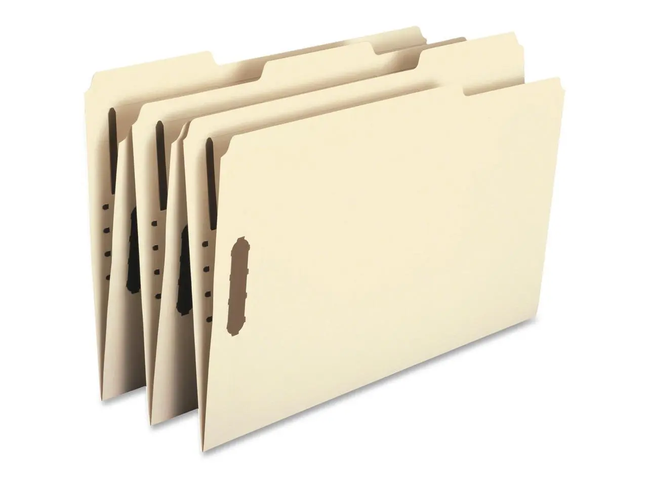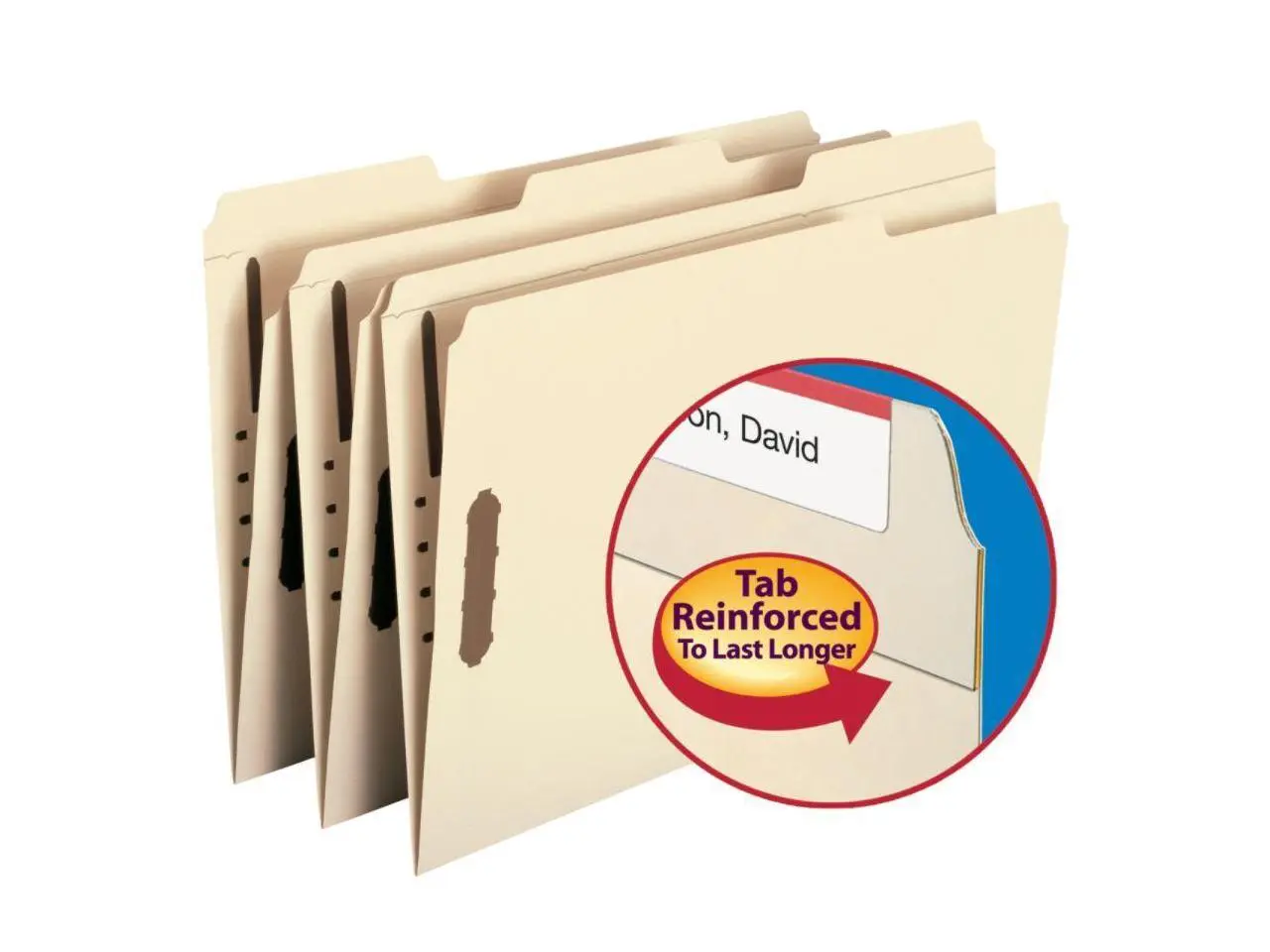 Smead Heavy-Duty Manila Fastener Folders - Legal - 8 1/2" x 14" Sheet Size - 2 Fastener (s) - 1/3 Tab Cut - Assorted Position Tab Location - 18 pt. Folder Thickness - Manila - Recycled - 50 / Box - Heavy-duty fastener folders feature a thicker paper stock that will stand up to the challenges of frequent or long-term use. Two fasteners per folder provide two separate filing surfaces and a secure way to organize your documents. 1/3-cut tabs are in assorted positions for easy access. Fastener folders are scored for 3/4" expansion and are made of 18 point manila stock.