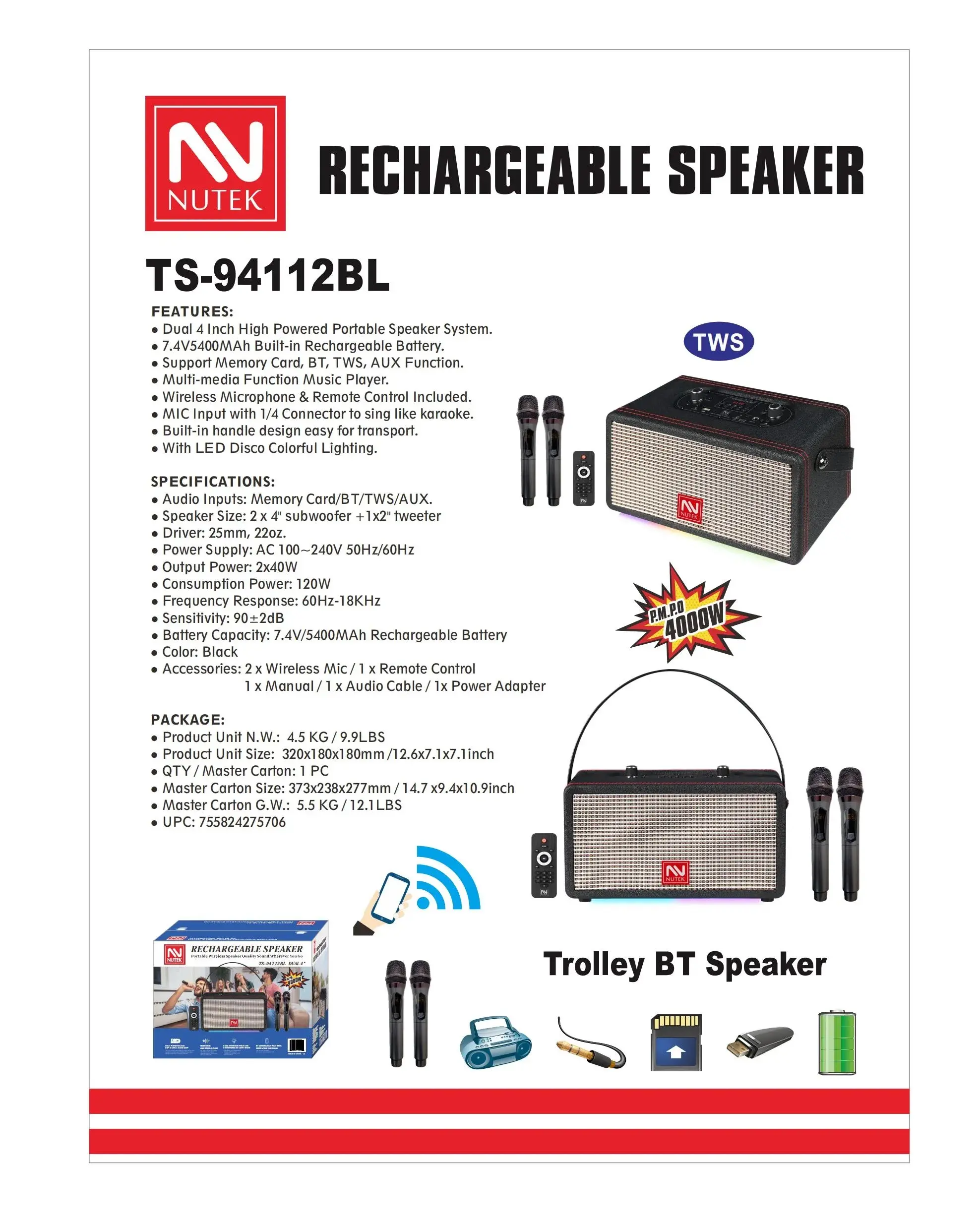 Audio Inputs: Memory Card/BT/TWS/AUX.
