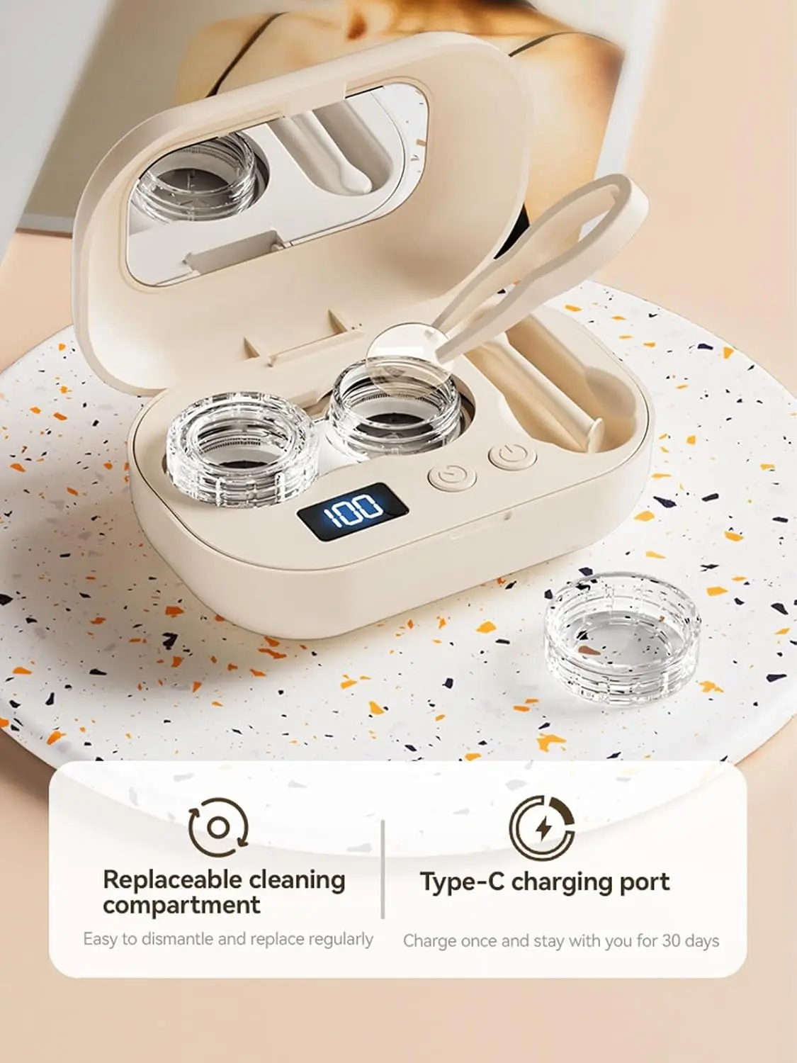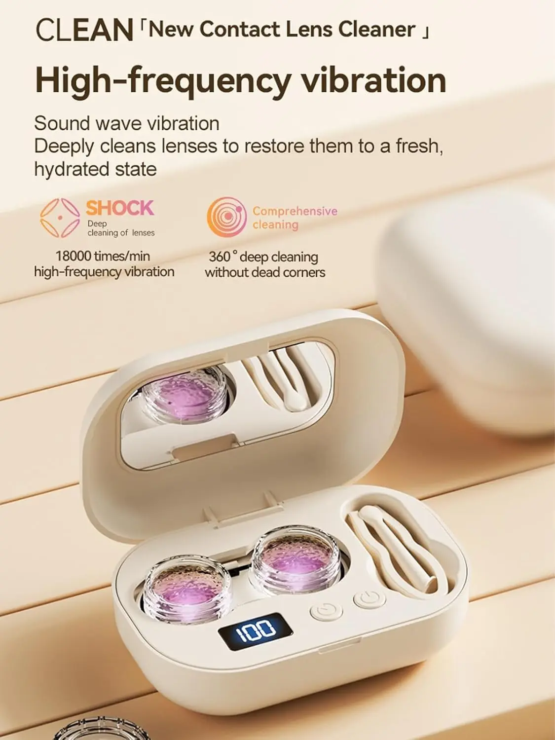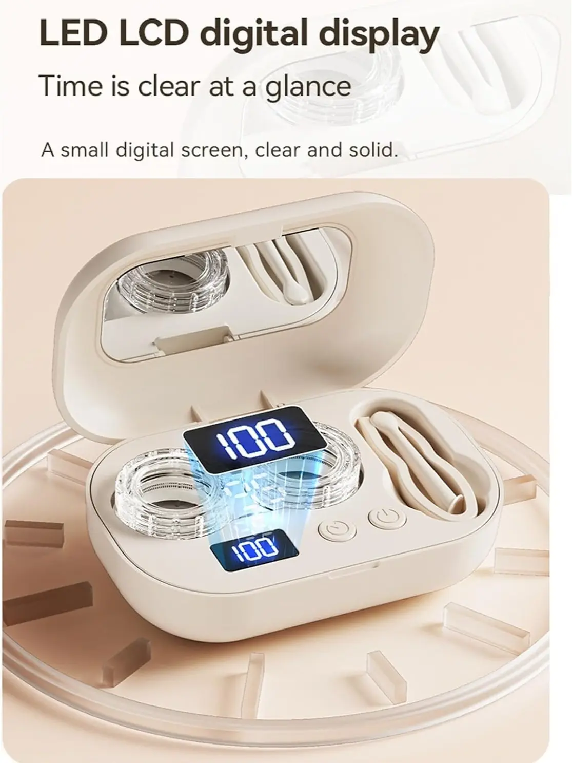 Keep your contact lenses fresh and clean with this compact ultrasonic contact lens cleaner. It features a built-in vanity mirror on the lid, making it convenient for daily use and travel.