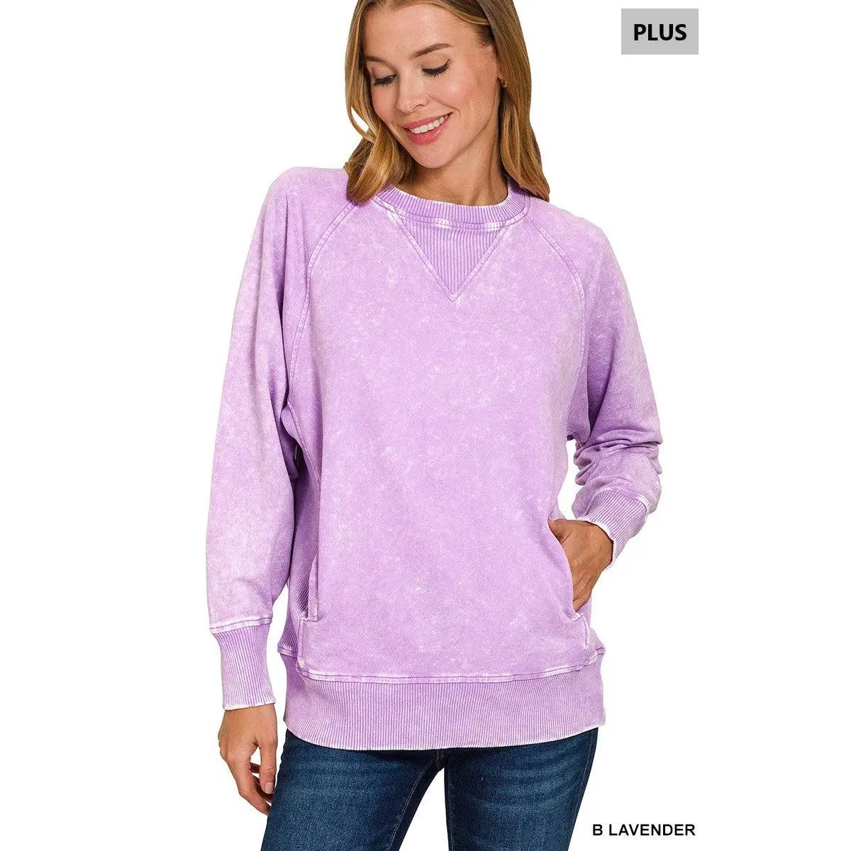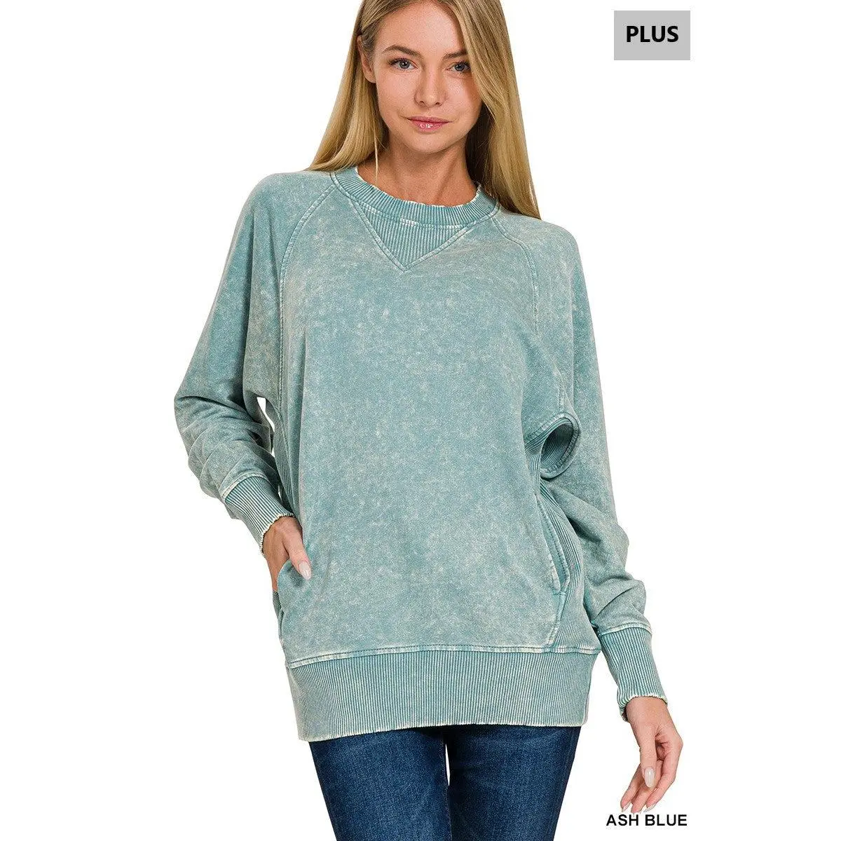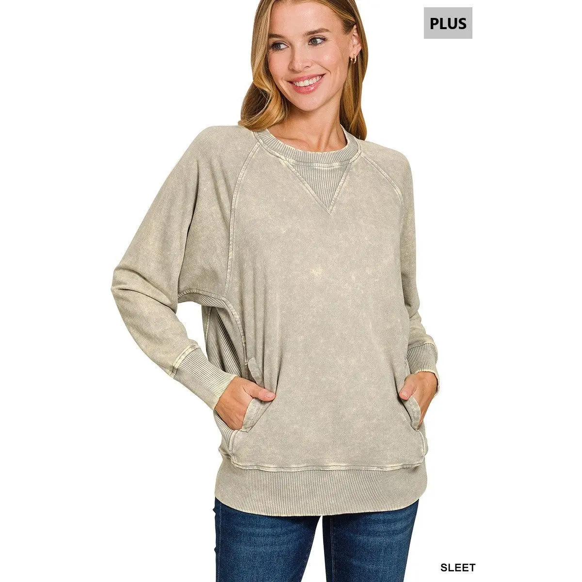 Zenana Plus Acid Washed French Terry Pullover with Pockets