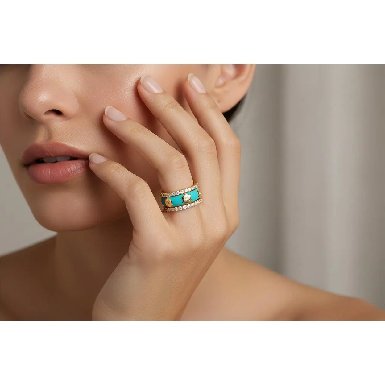 ·Turquoise enamel ring with floral accents and center cz stone