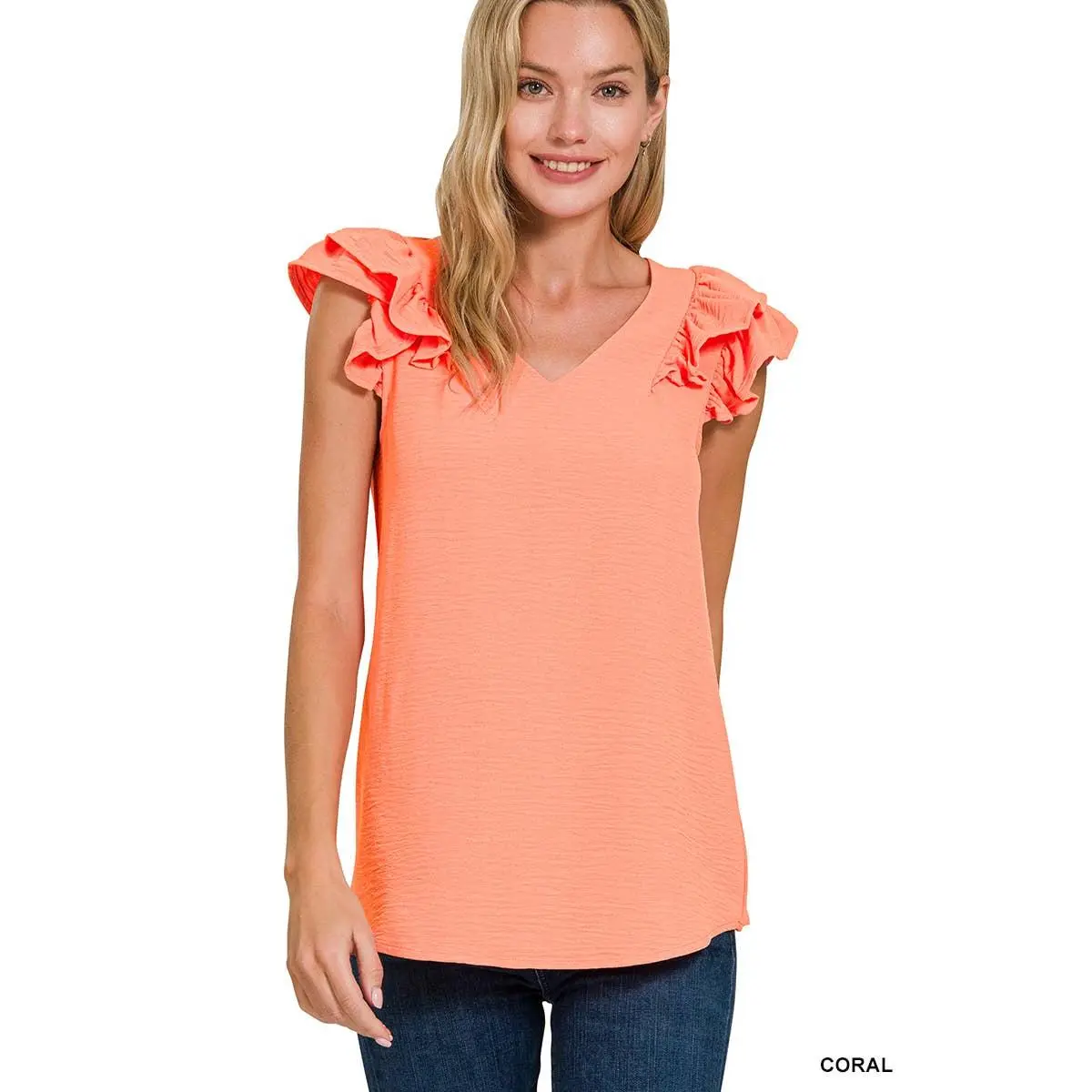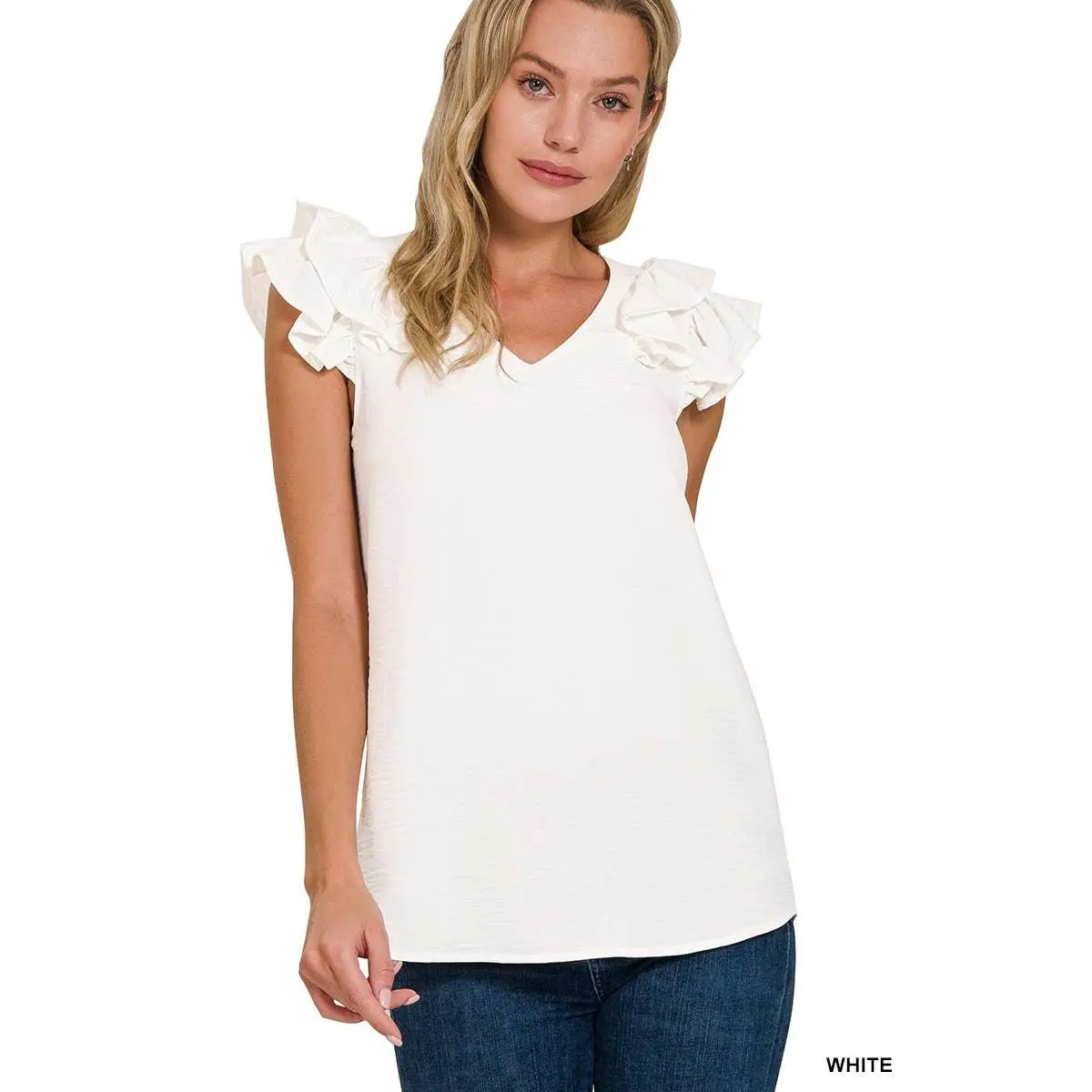 WOVEN AIRFLOW TIERED RUFFLE SLEEVE TOP Blouse - TIERED RUFFLE SLEEVE TOTAL BODY LENGTH: 26.5", CHEST: 36" - MEASURED FROM SMALL Fabric Content: 100% POLYESTER SI-16606 Ruffle Trim Sleeveless Top (100% polyester) Float through your day in effortless elegance with the Airflow Tiered Ruffle Sleeve Top – where lightweight comfort meets chic sophistication. ✨💖 Perfect for every occasion, this breezy beauty adds a touch of romance to your wardrobe! Pair it with jeans, pants, shorts or event with a skirt. It can be everyday casual or classy.