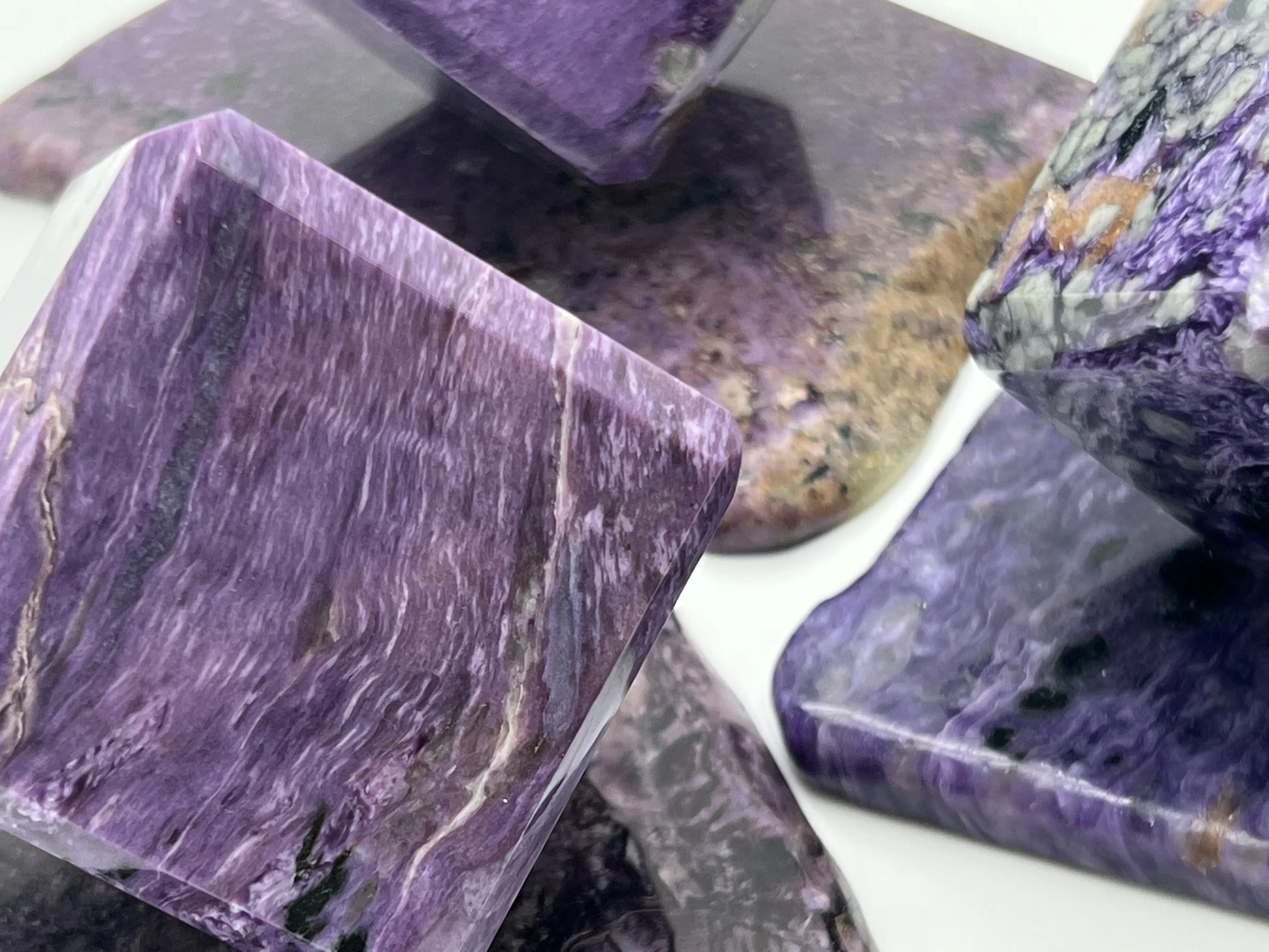 Mineralogically, Charoite forms in a monoclinic crystal structure, which contributes to its signature fibrous, swirling patterns and its ability to channel cleansing, transformative energy.