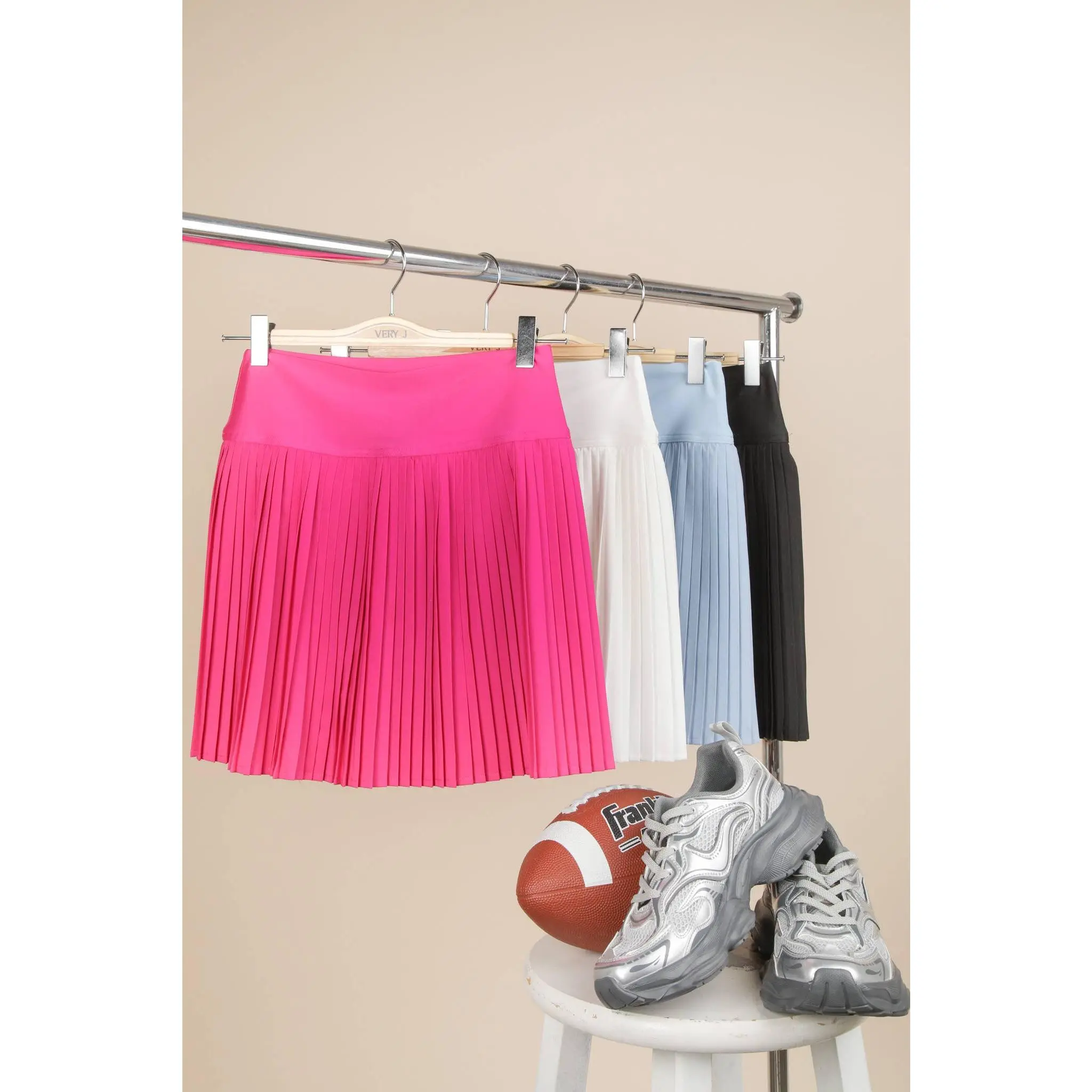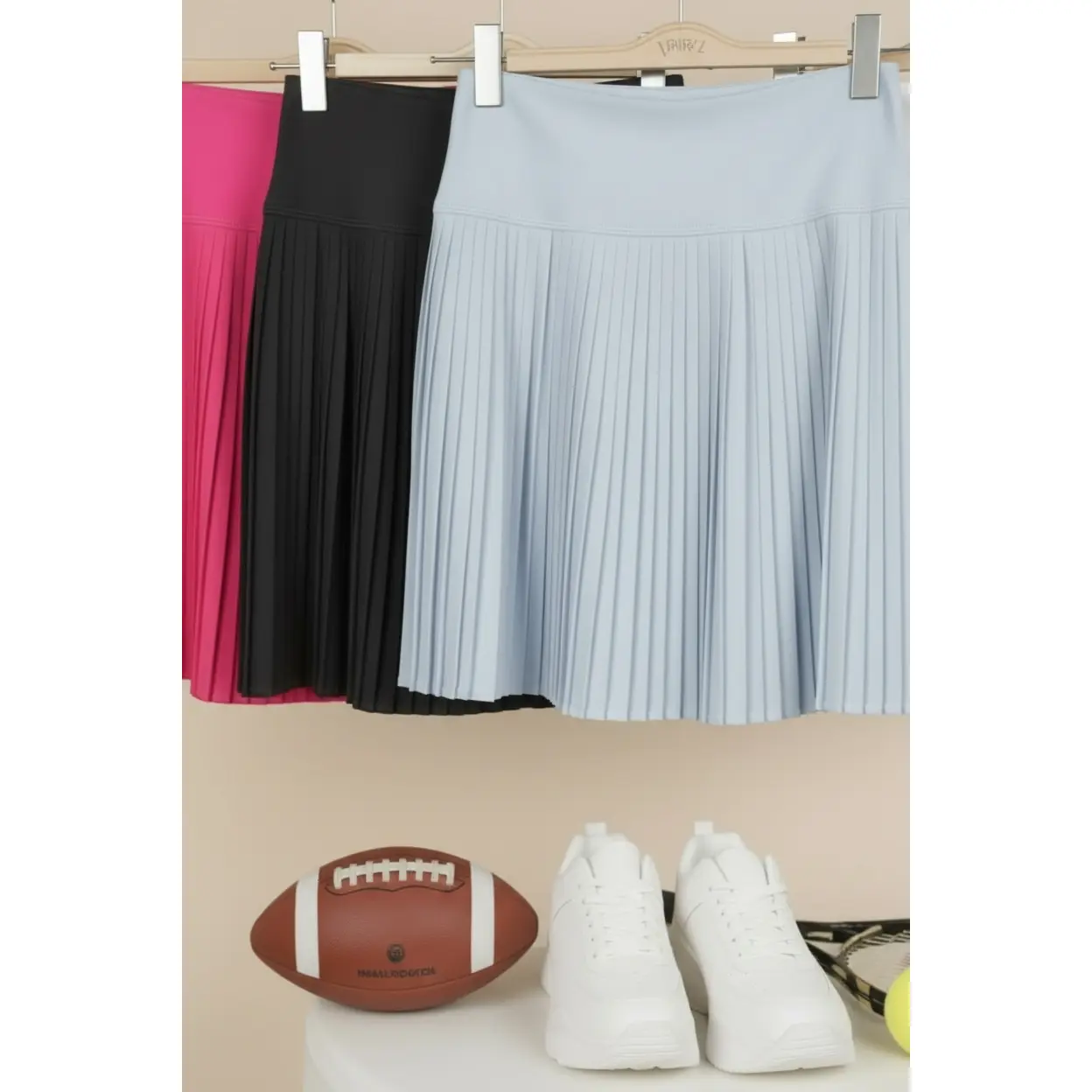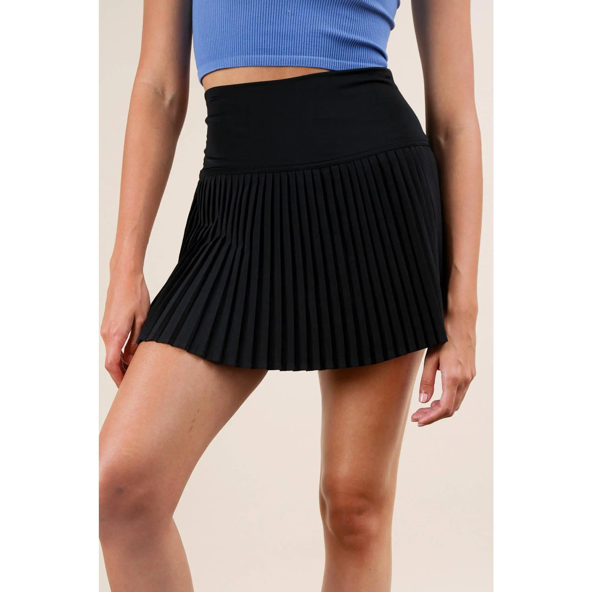 This Pleated Activewear Skirt features shorts inside, a short lining with pockets, a wide waist band, and is designed for athleisure wear. The model is 5'8" and wearing a size Small.